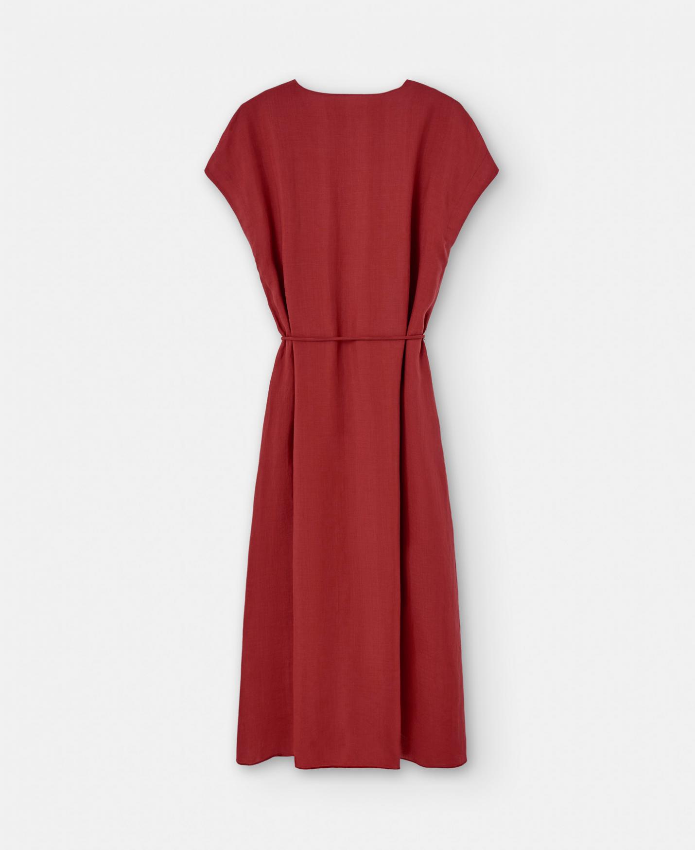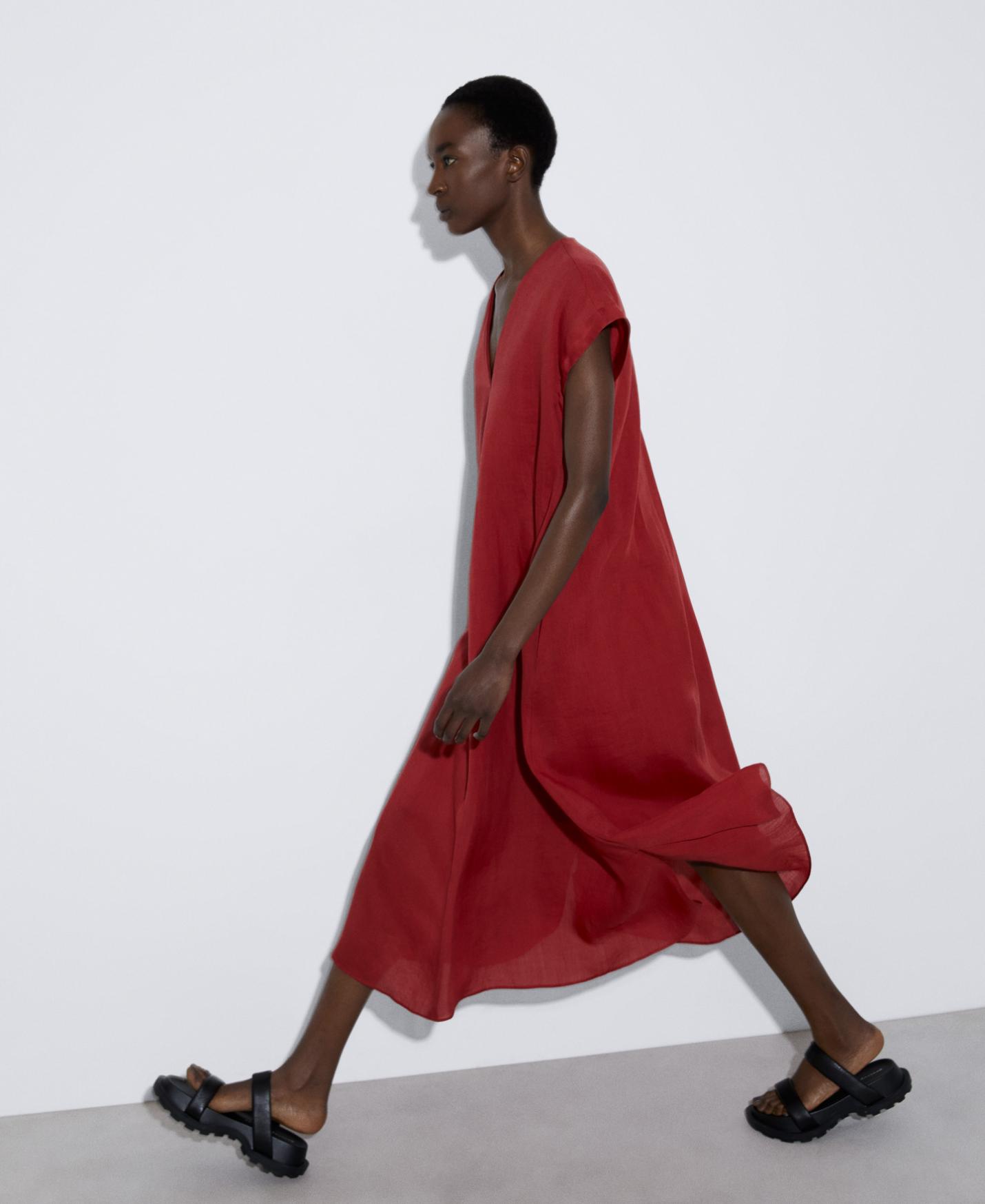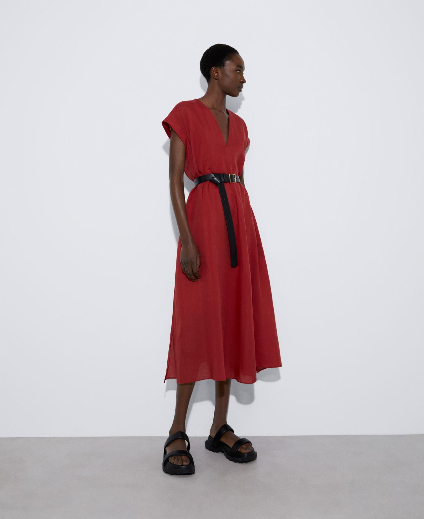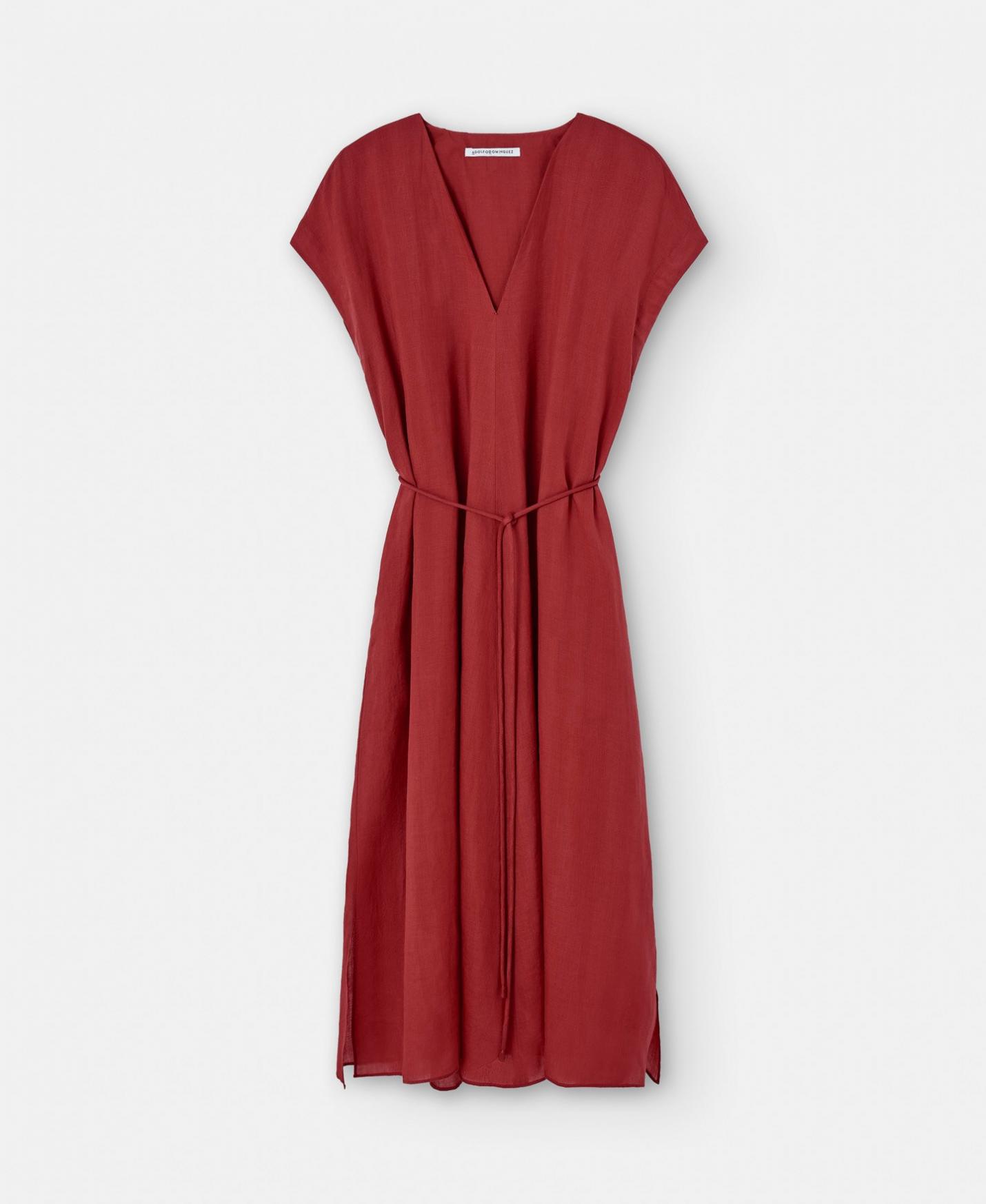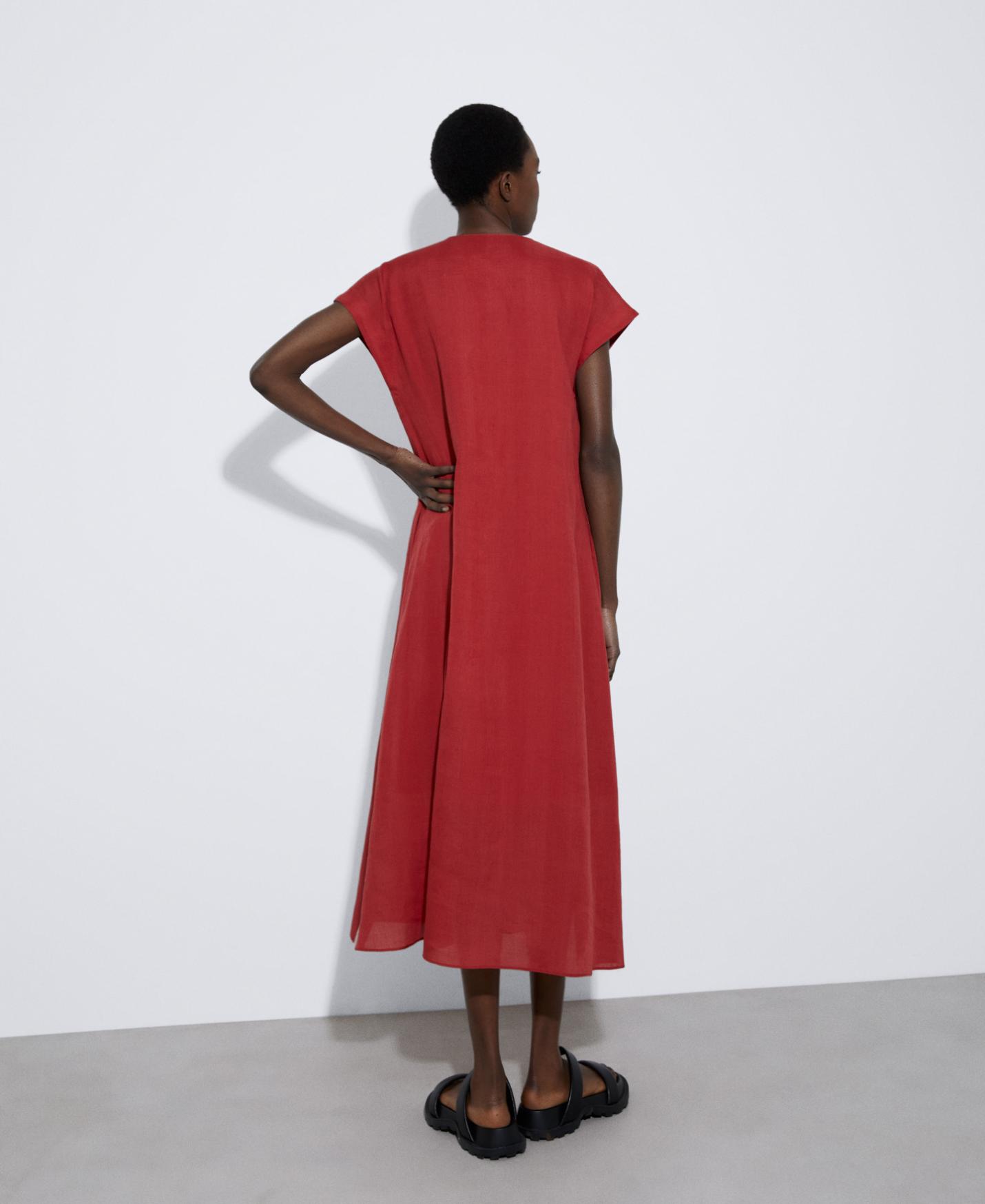 Vestido de línea evasé en ramio responsable y lyocell. Forro de voile de algodón. Tiene manga japonesa, escote pico, pliegue central y cinturón extraíble.