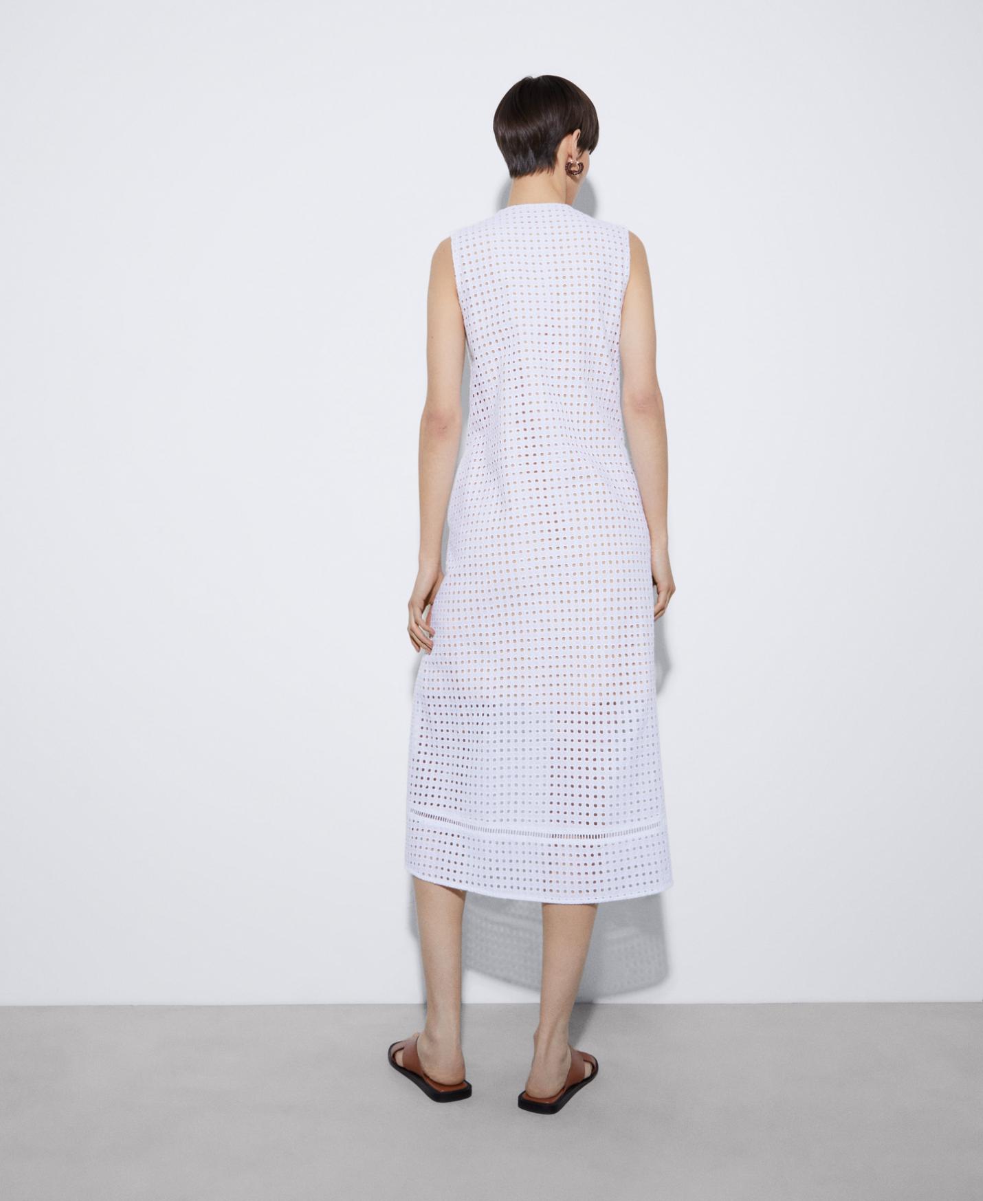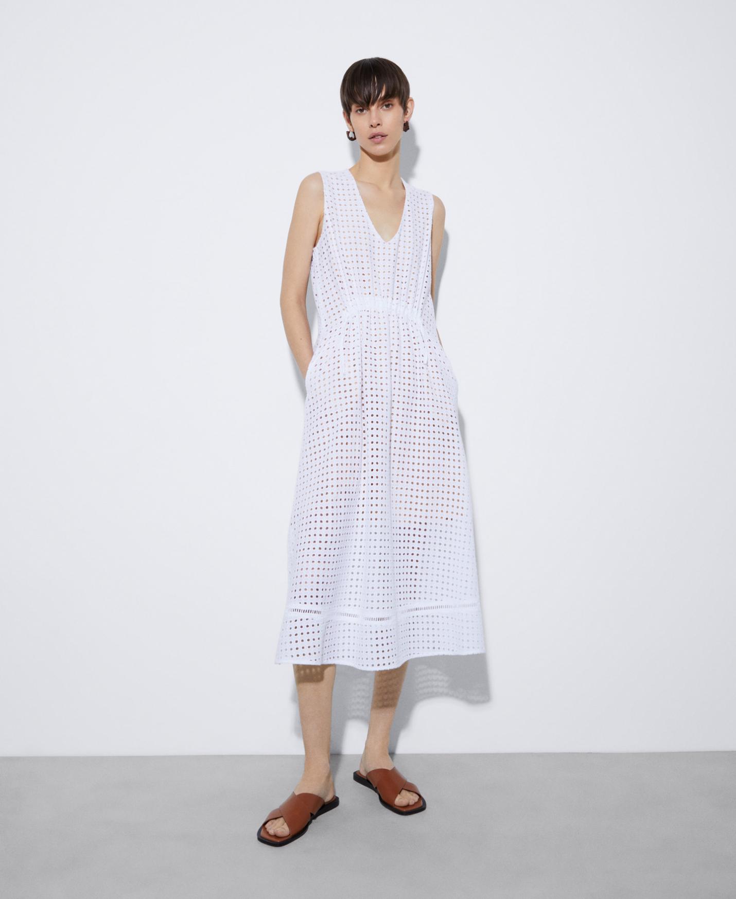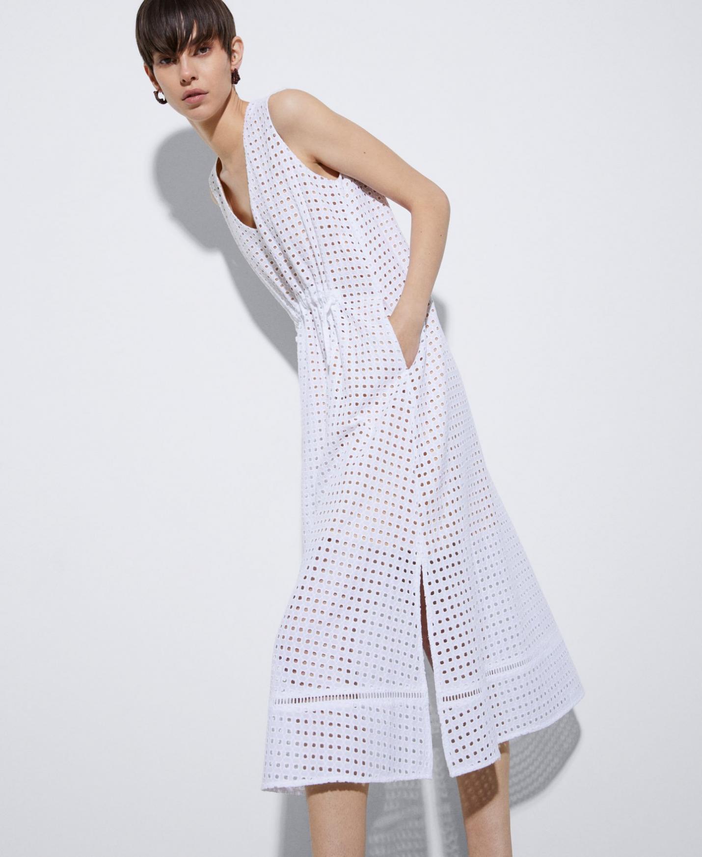 Vestido en 100% algodón con detalle bordado. Escote pico. Frunce en cintura. Aberturas laterales. Manga sisa.