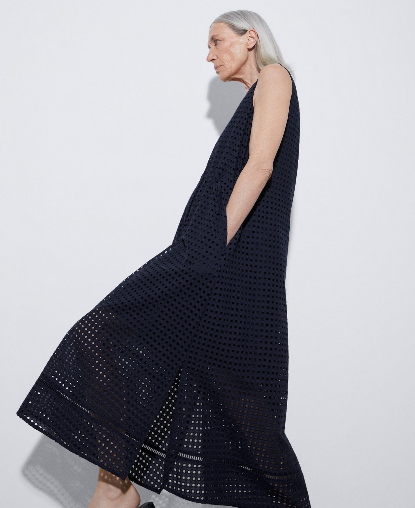 Vestido largo con aberturas laterales en 100% algodón. Detalle de frunces. Trabajo de logotipo bordado.