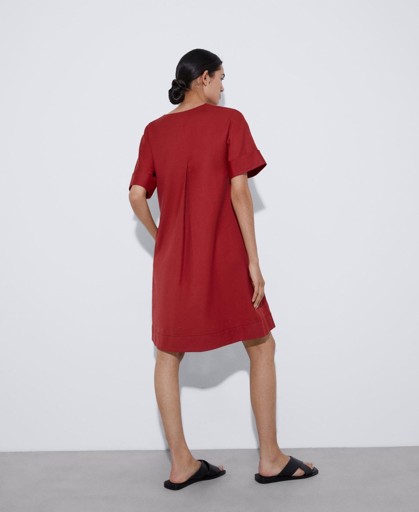 Vestido de línea A en lino y algodón. Escote pico, manga corta con doble vuelta y largo rodilla.