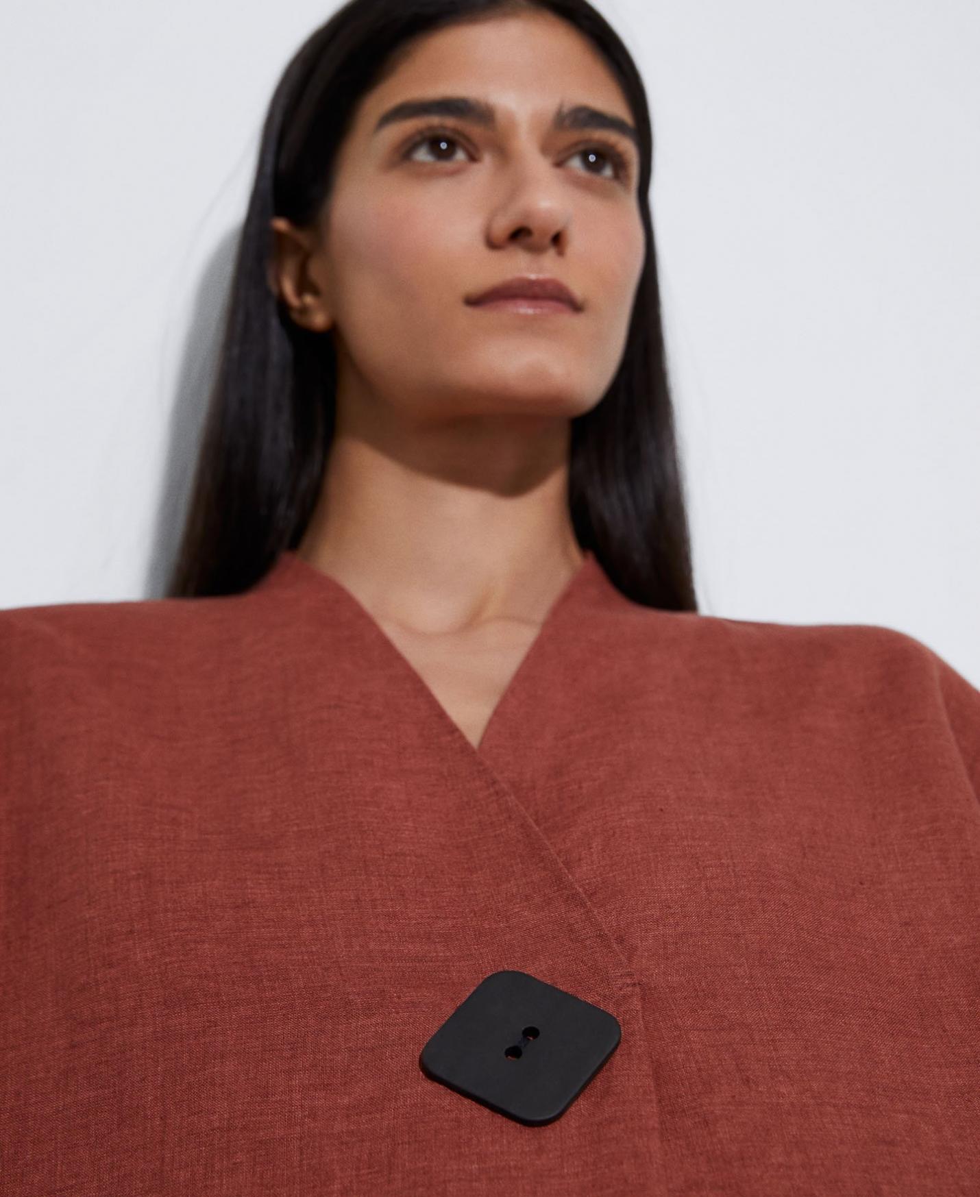 Vestido de línea recta en lino europeo. Largo 3/4, de aspecto lavado, con cuello chal y manga japonesa.