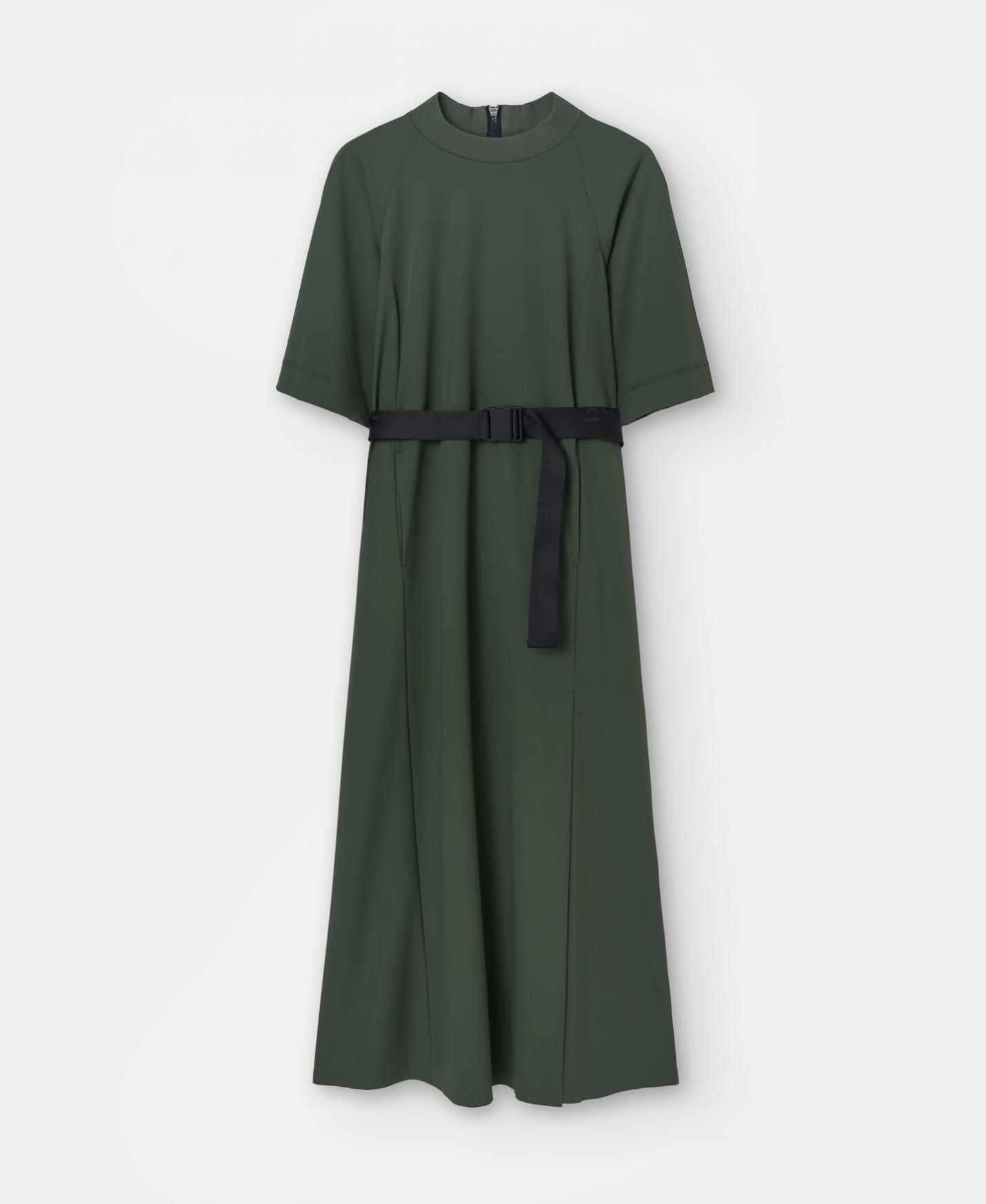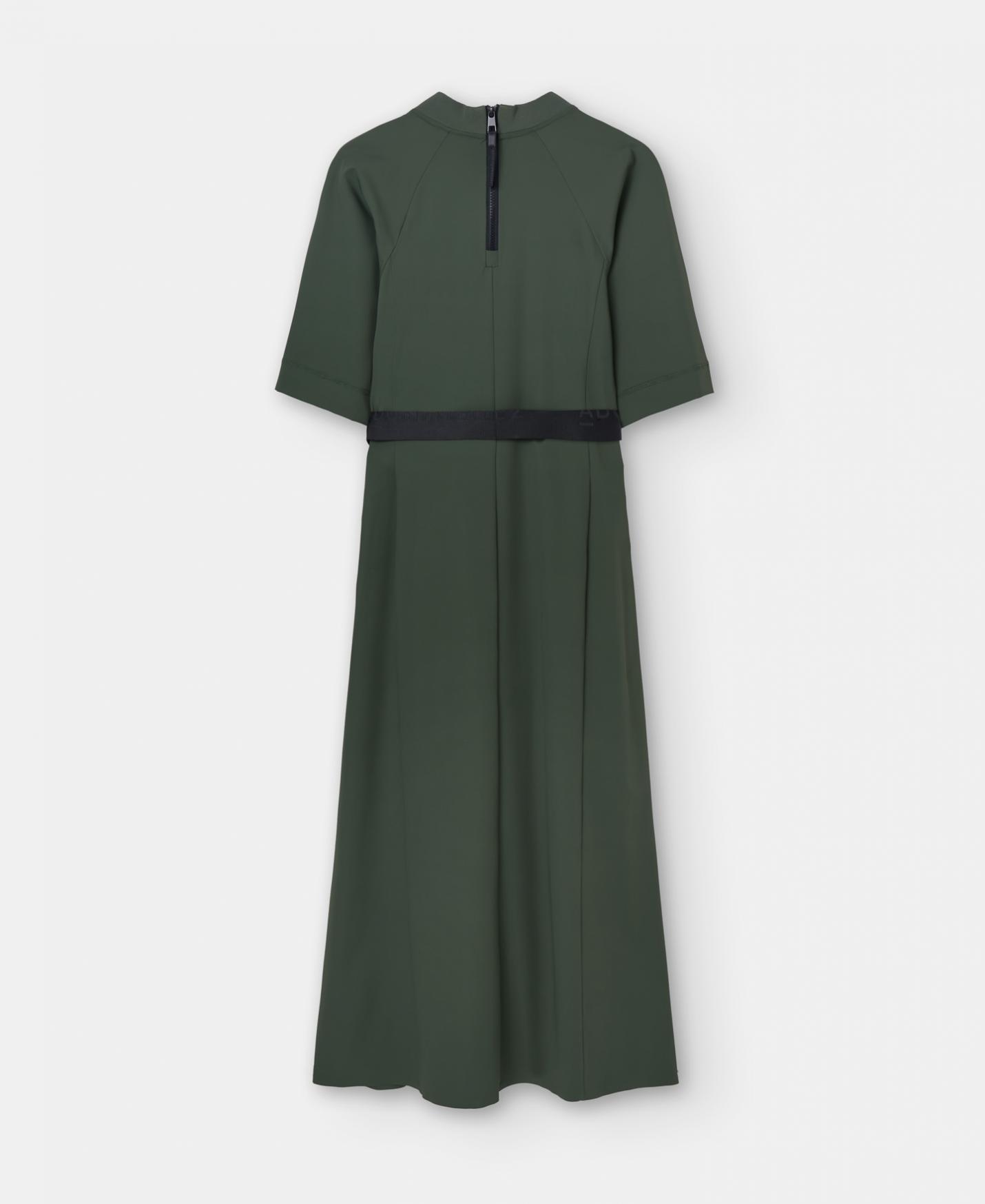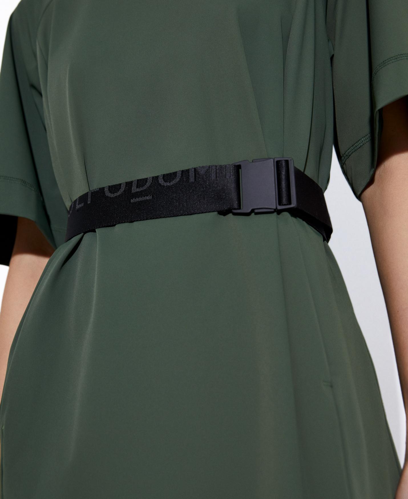 Vestido maxi confeccionado en nylon convencional y nylon reciclado. Tiene cuello de punto a tono. Su manga, de largo codo, es ligeramente evasé y remata en punto de adorno. Además, presenta abertura y bolsillos en delantero, y su cinturón con logo jacquarizado puede incluirse o retirarse.