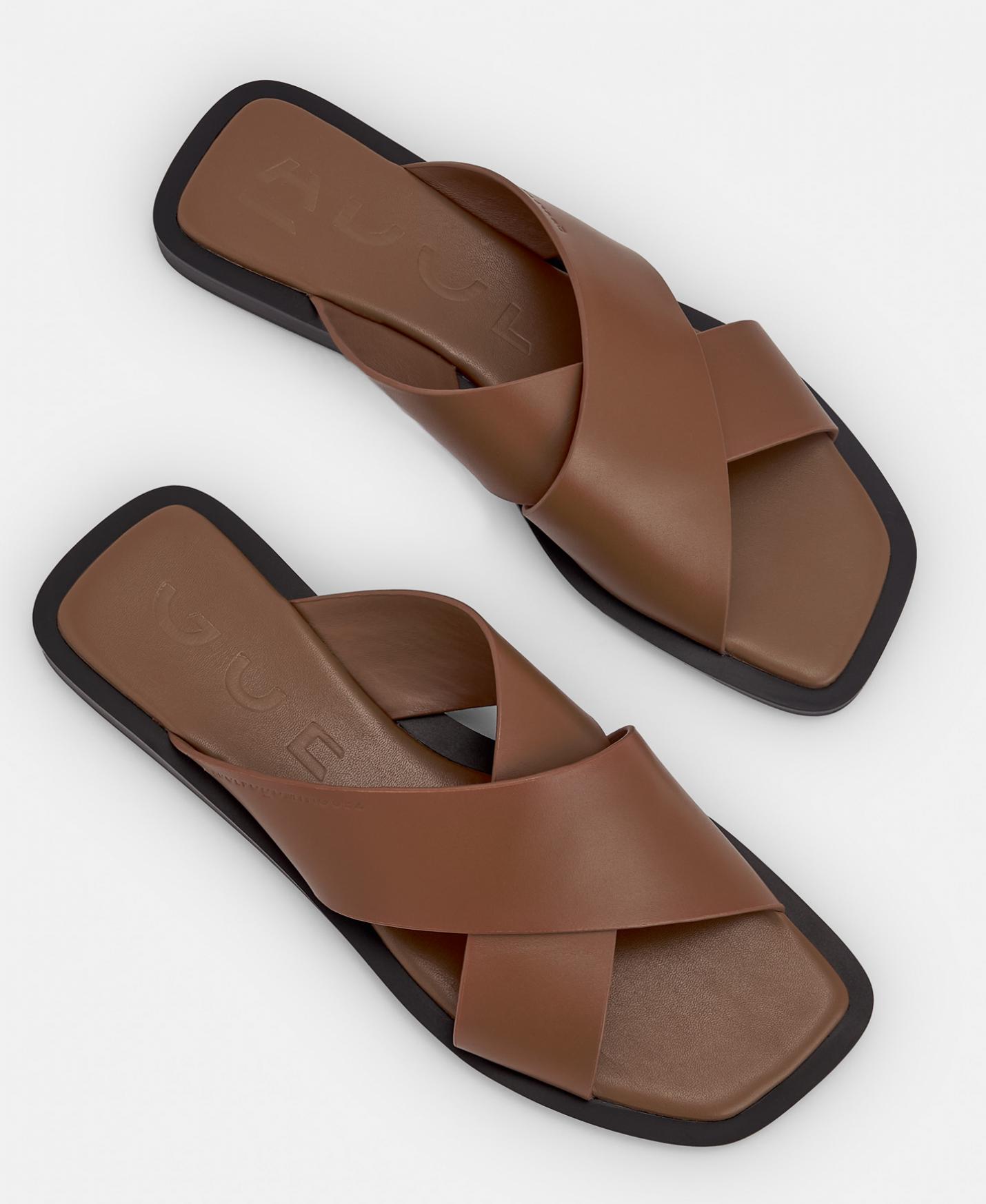 Sandalia en 100% piel. Tiene pala cruzada, suela memory foam con marcas antideslizantes, tacón de 1,5 cm y logotipo repujado sobre la piel.