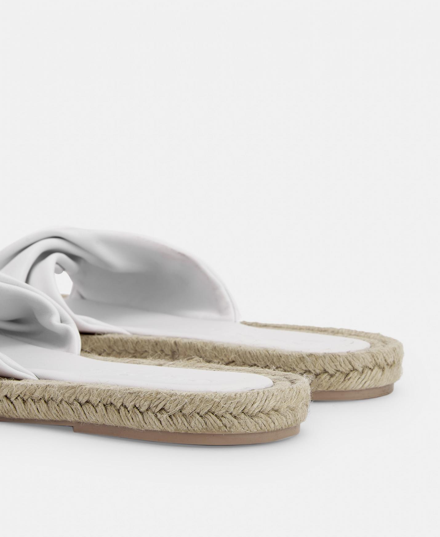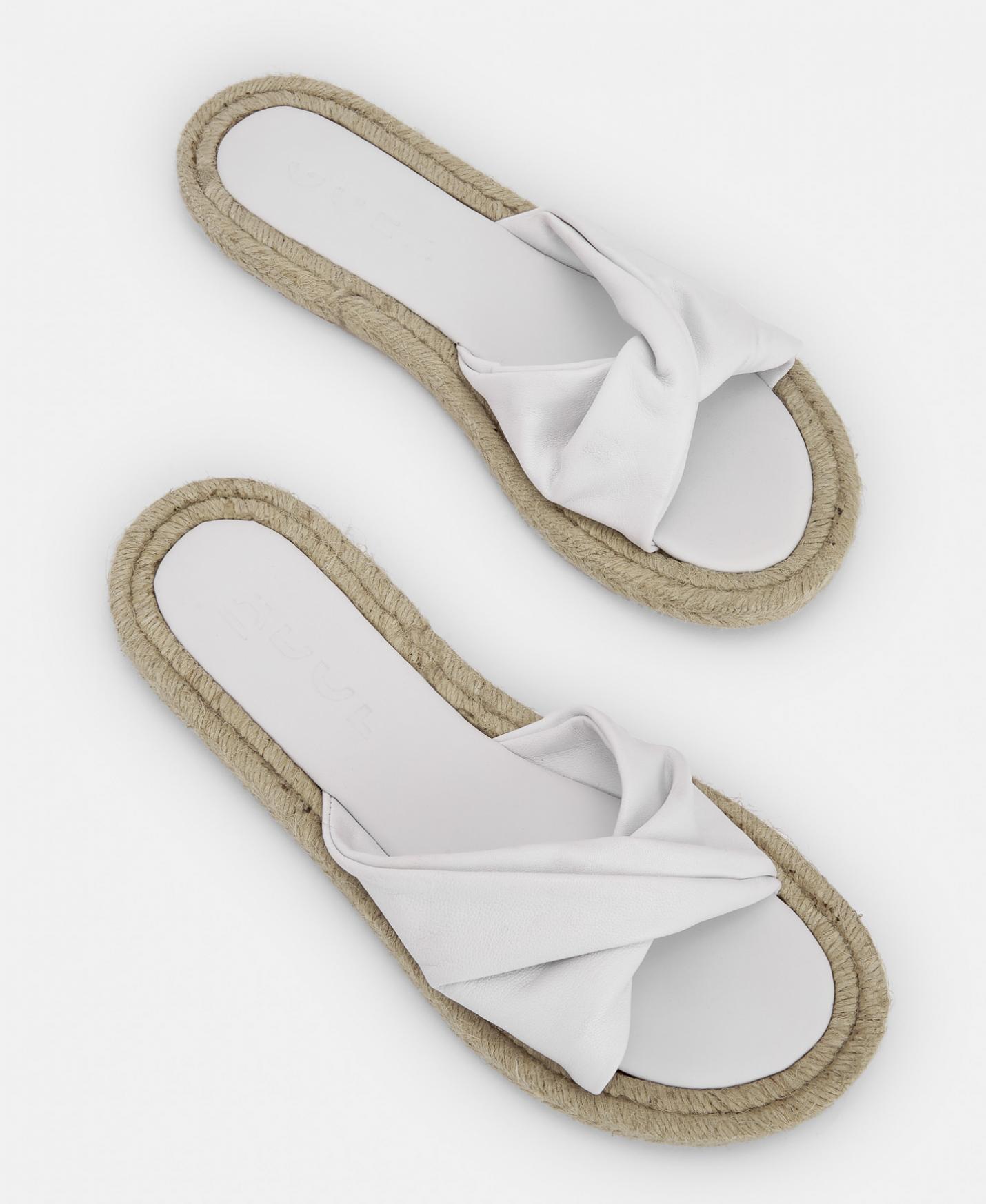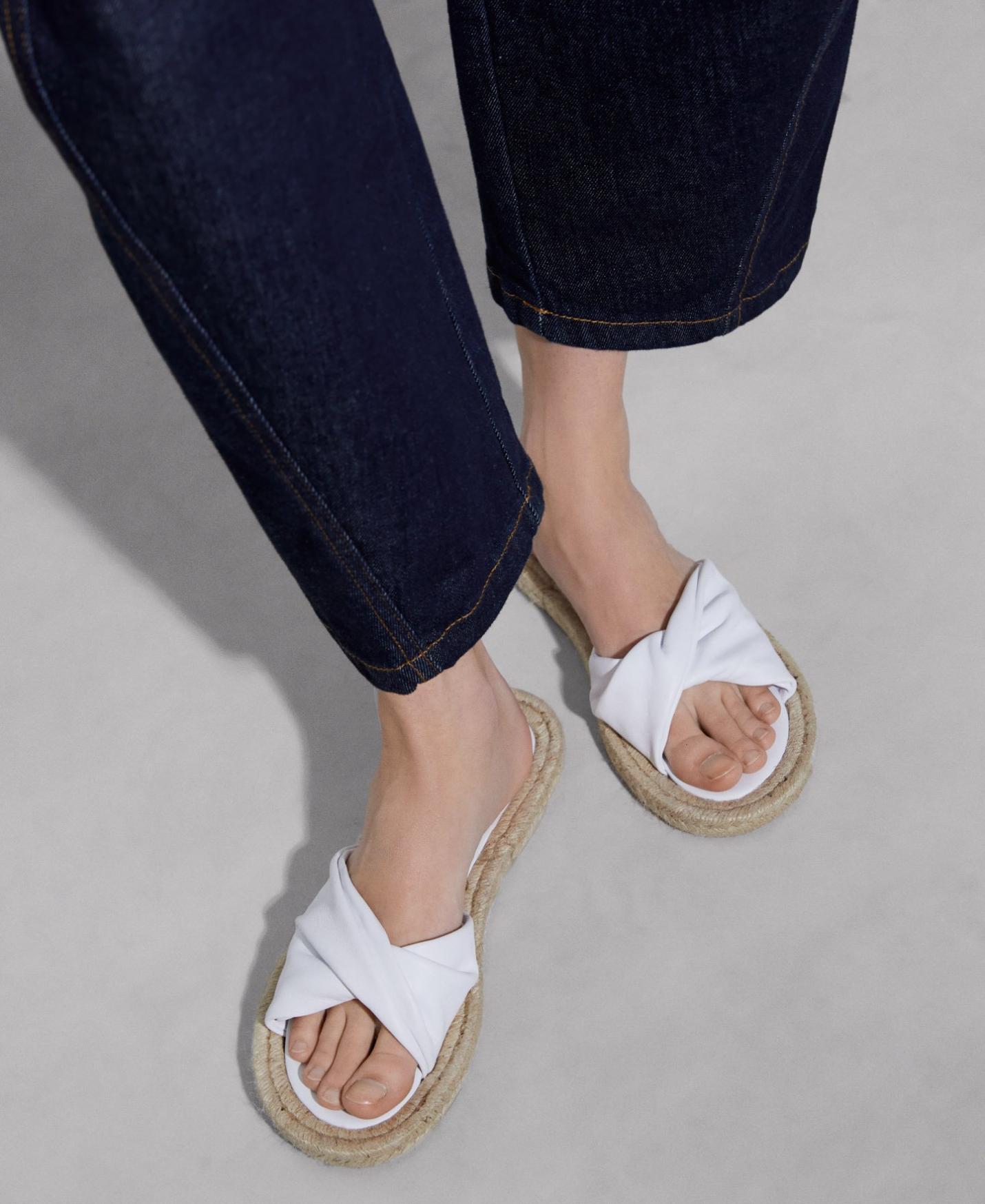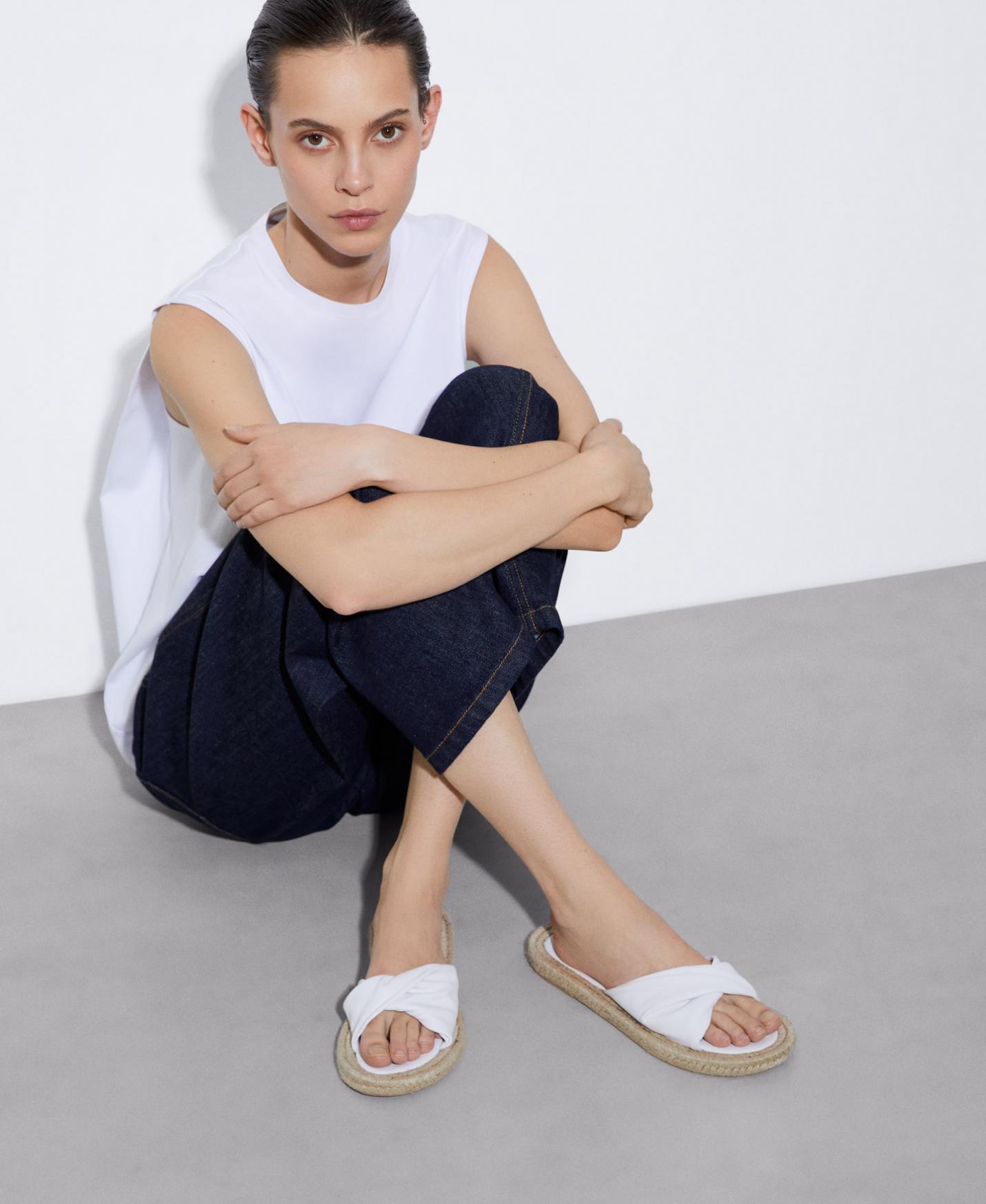 Sandalia plana hecha en España. Con suela de yute y maxi pala drapeada y acolchada.