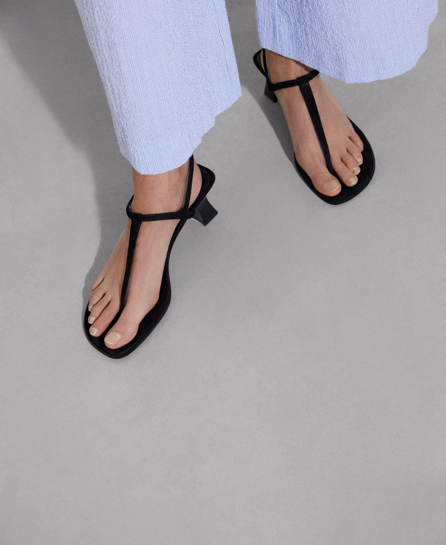 Sandalia con tacón bajo, posición para dedo y tira ajustable con hebilla en talón. Hecha en España.