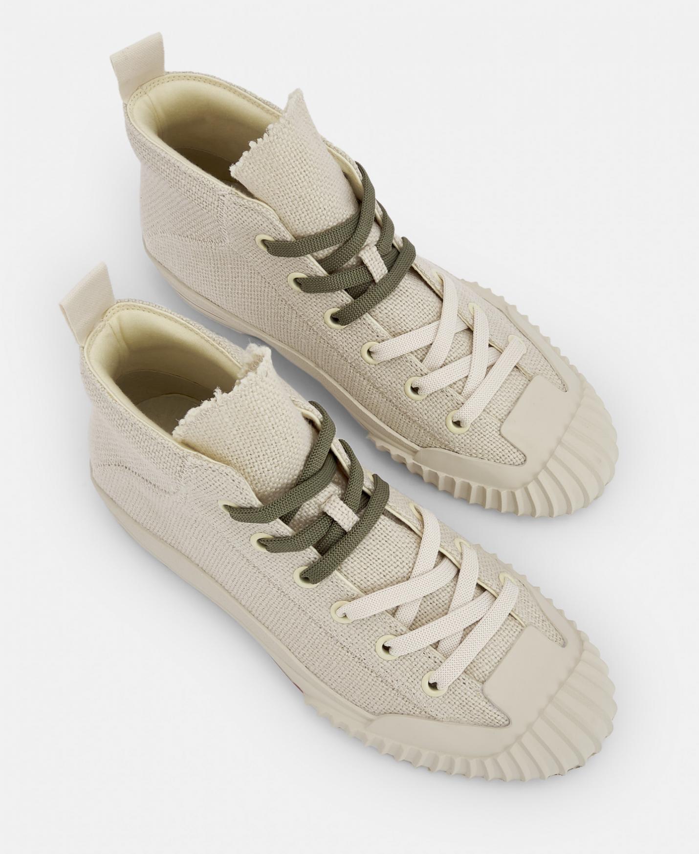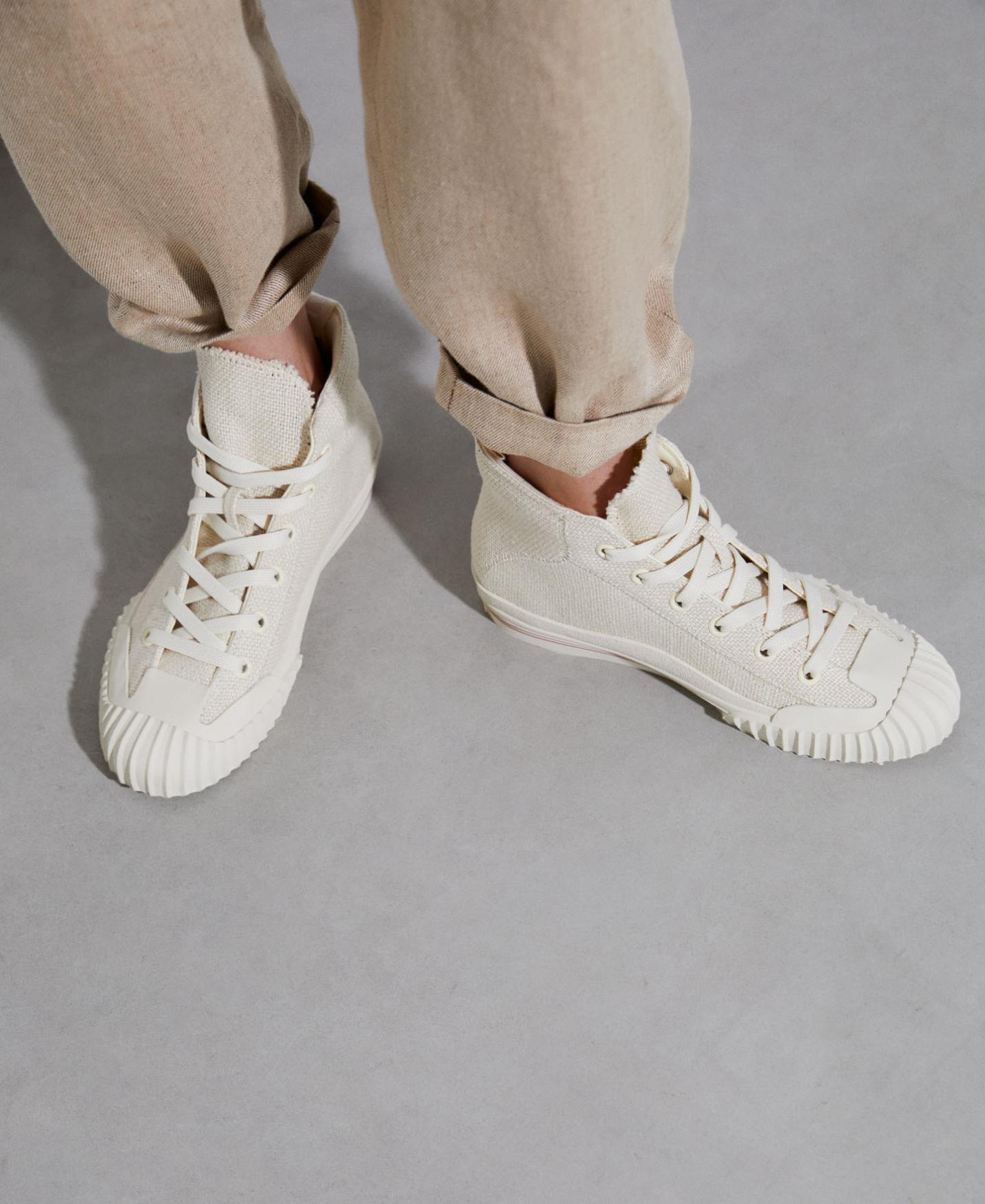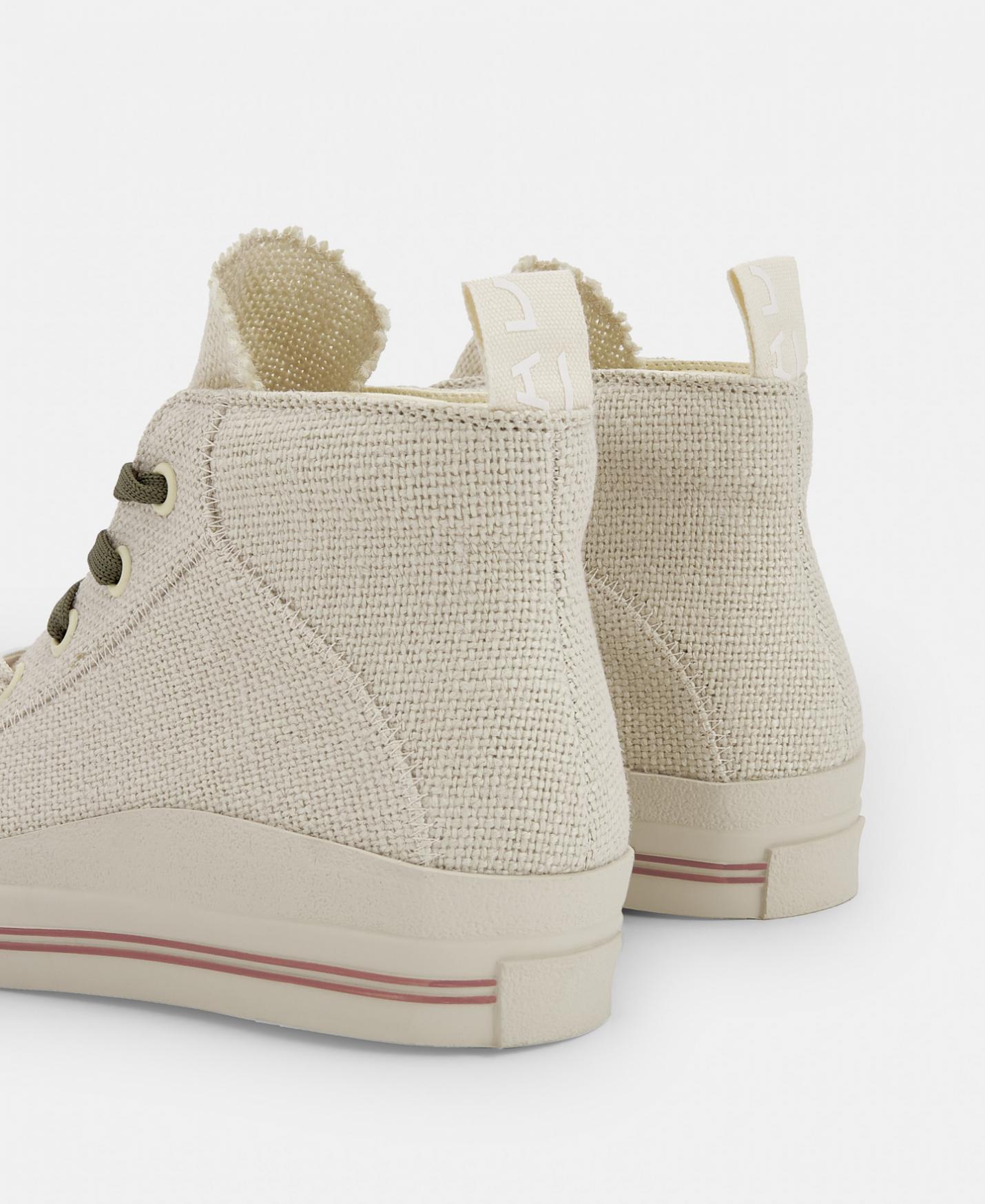 Zapatilla abotinada en lino. Tiene cierre de cordones, forro y plantilla de algodón orgánico y suela memory foam. Incluye segundo juego de cordones.