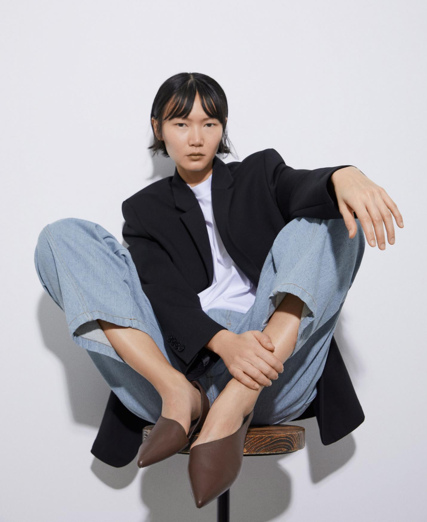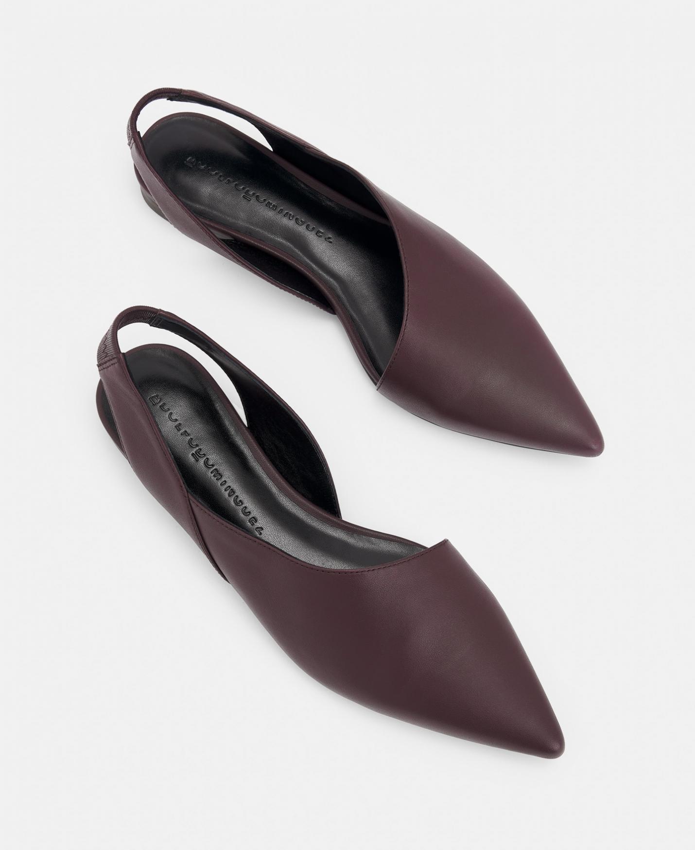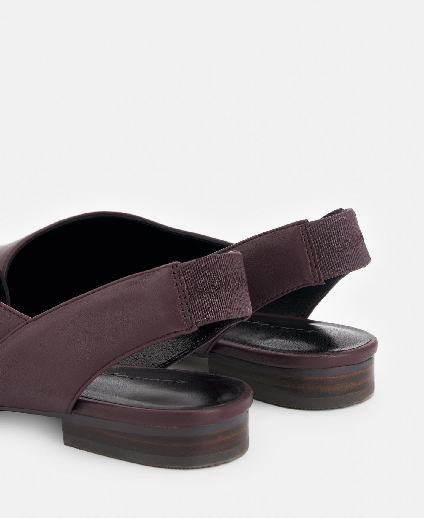 Zapato bajo en piel. Talón abierto, tacón bajo, punta fina. Suela de caucho.