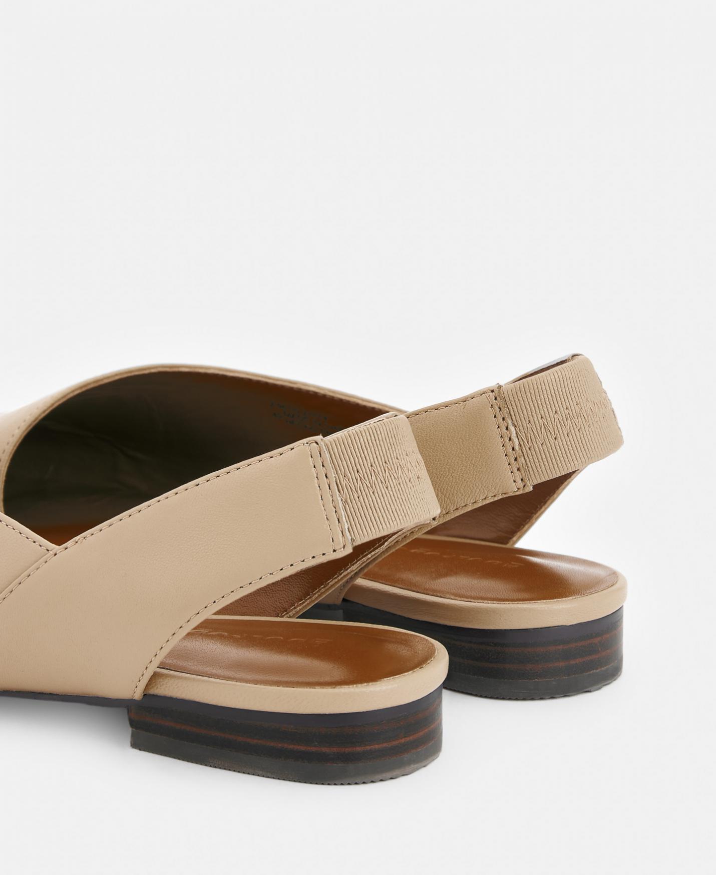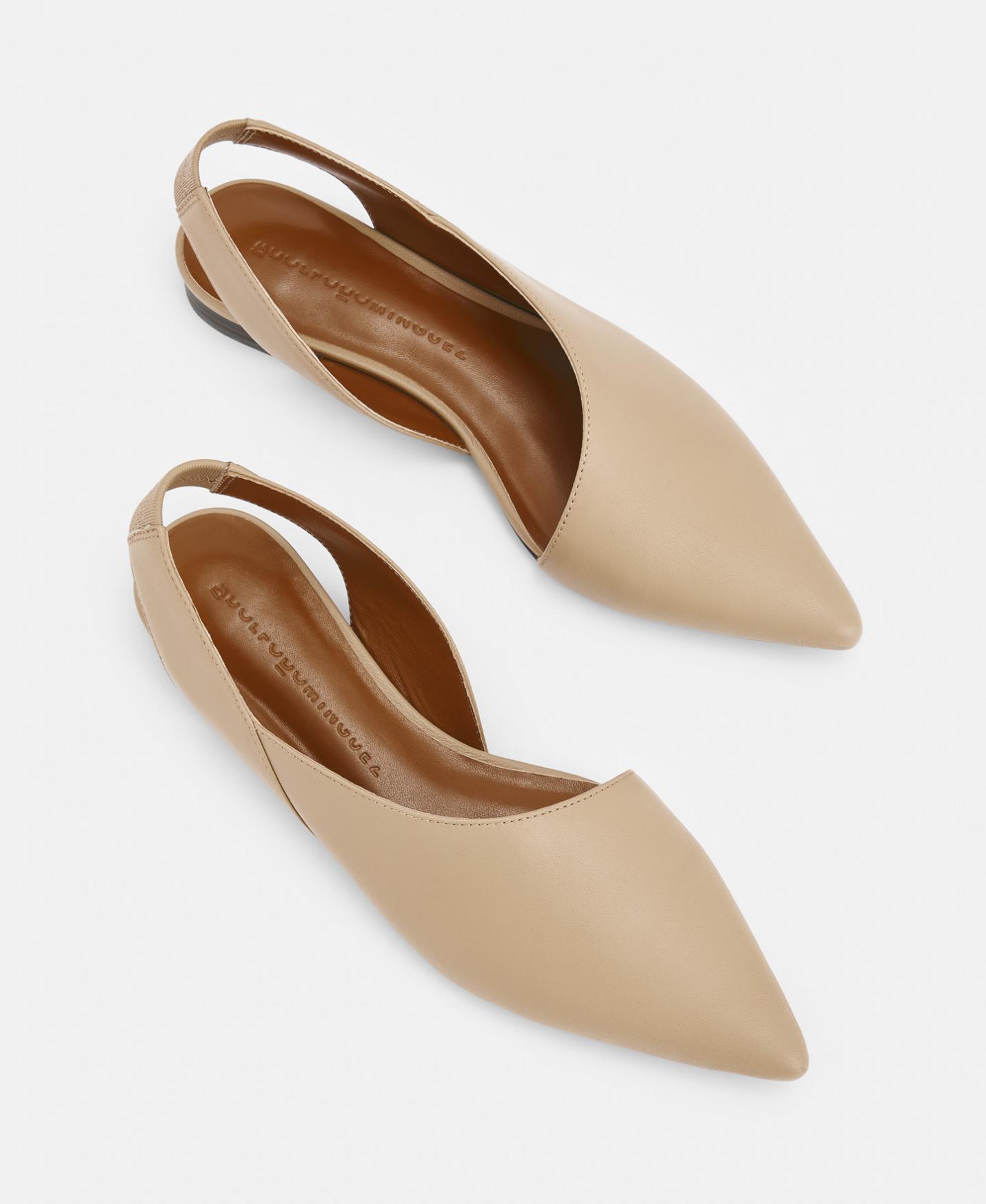 Zapato bajo en piel. Talón abierto, tacón bajo, punta fina. Suela de caucho.