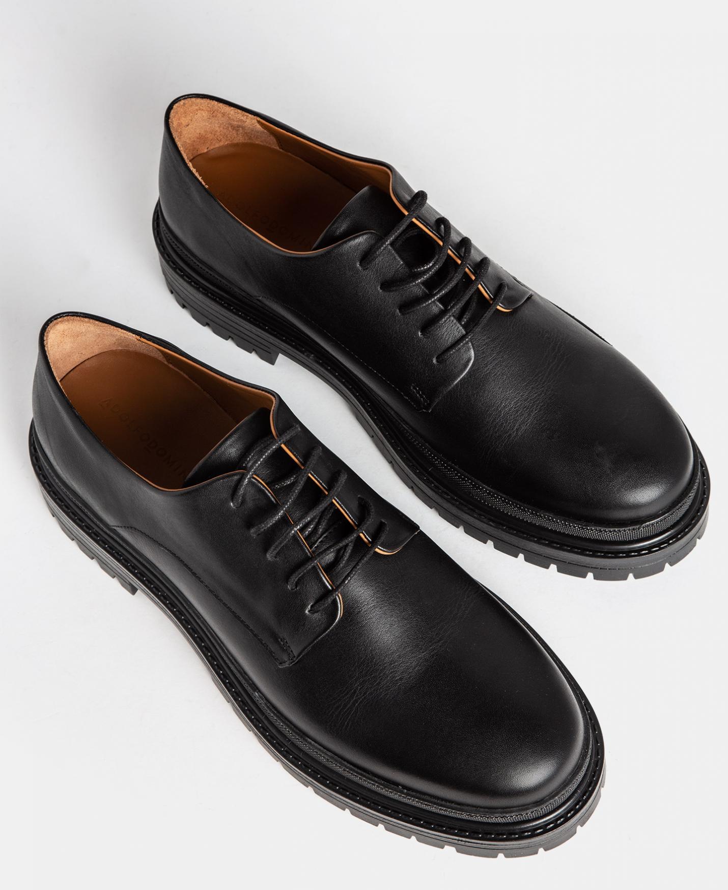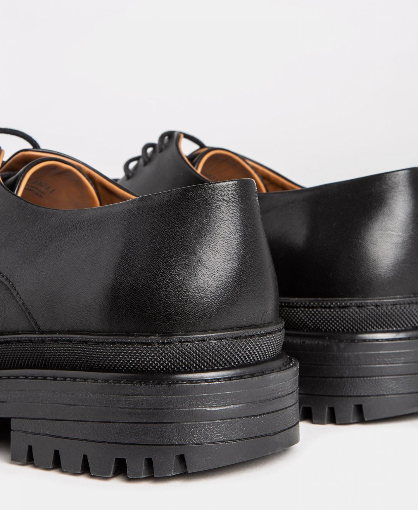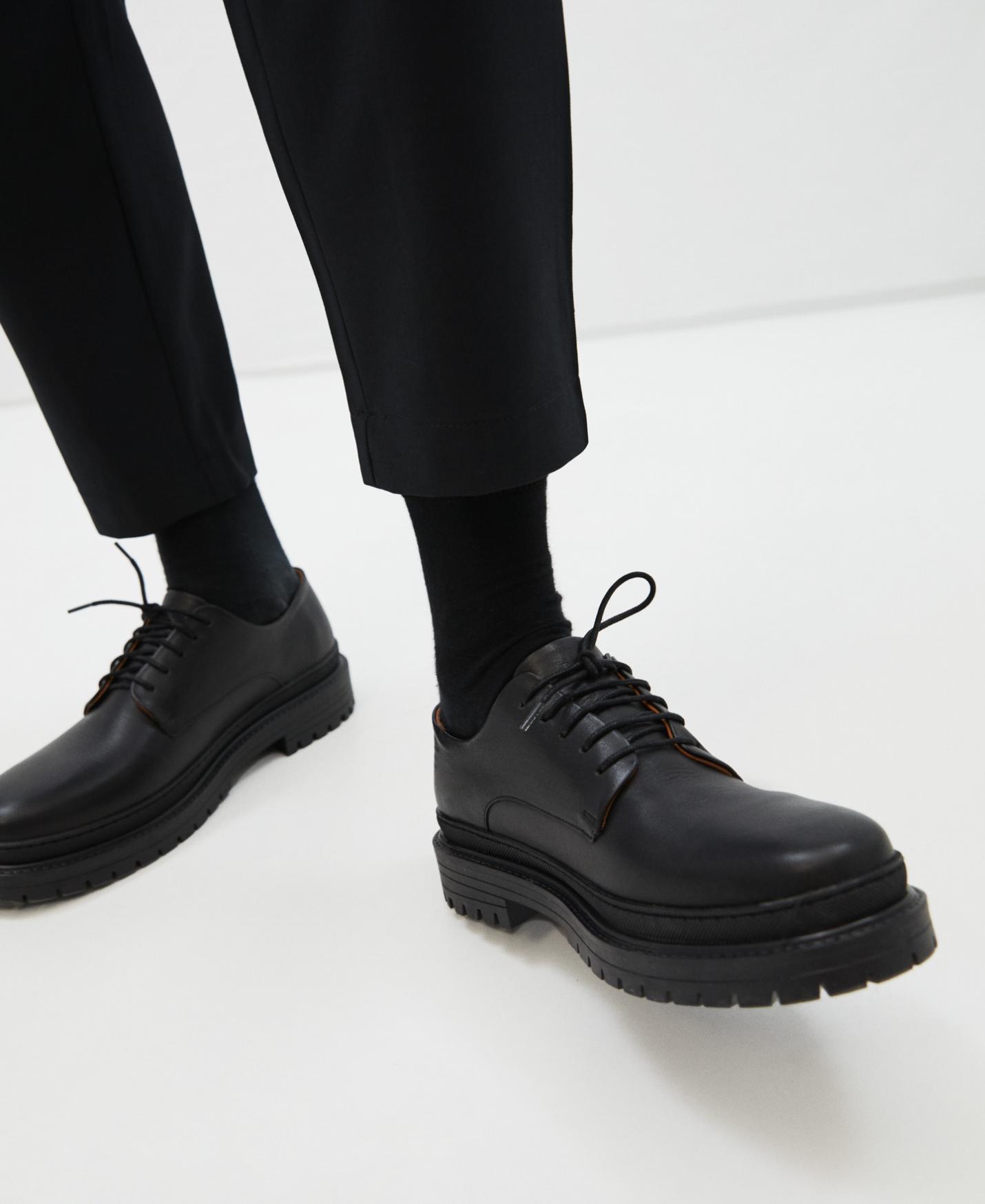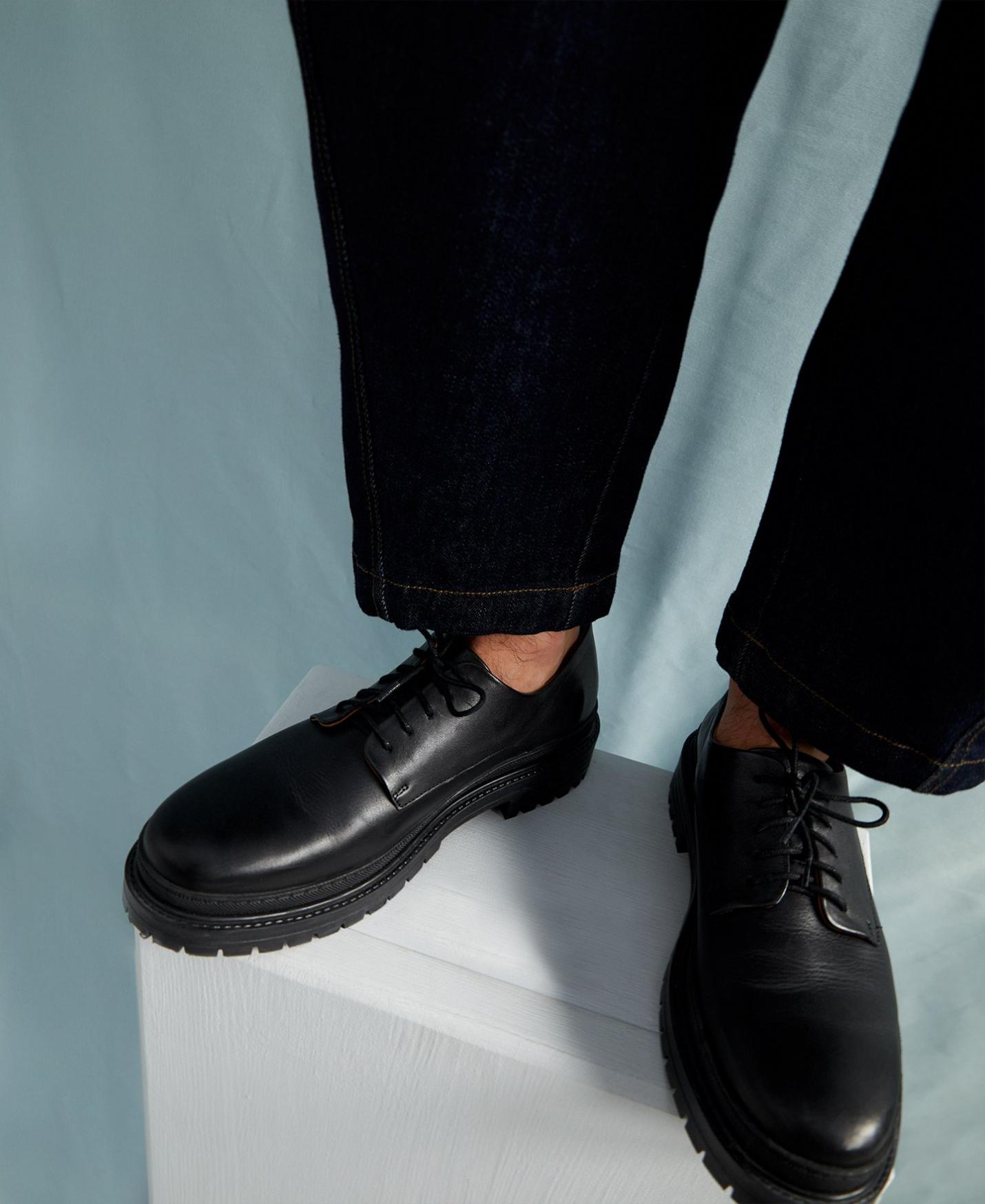 Zapato Derby en piel con empeine alto. Cierre de cordones y suela track.