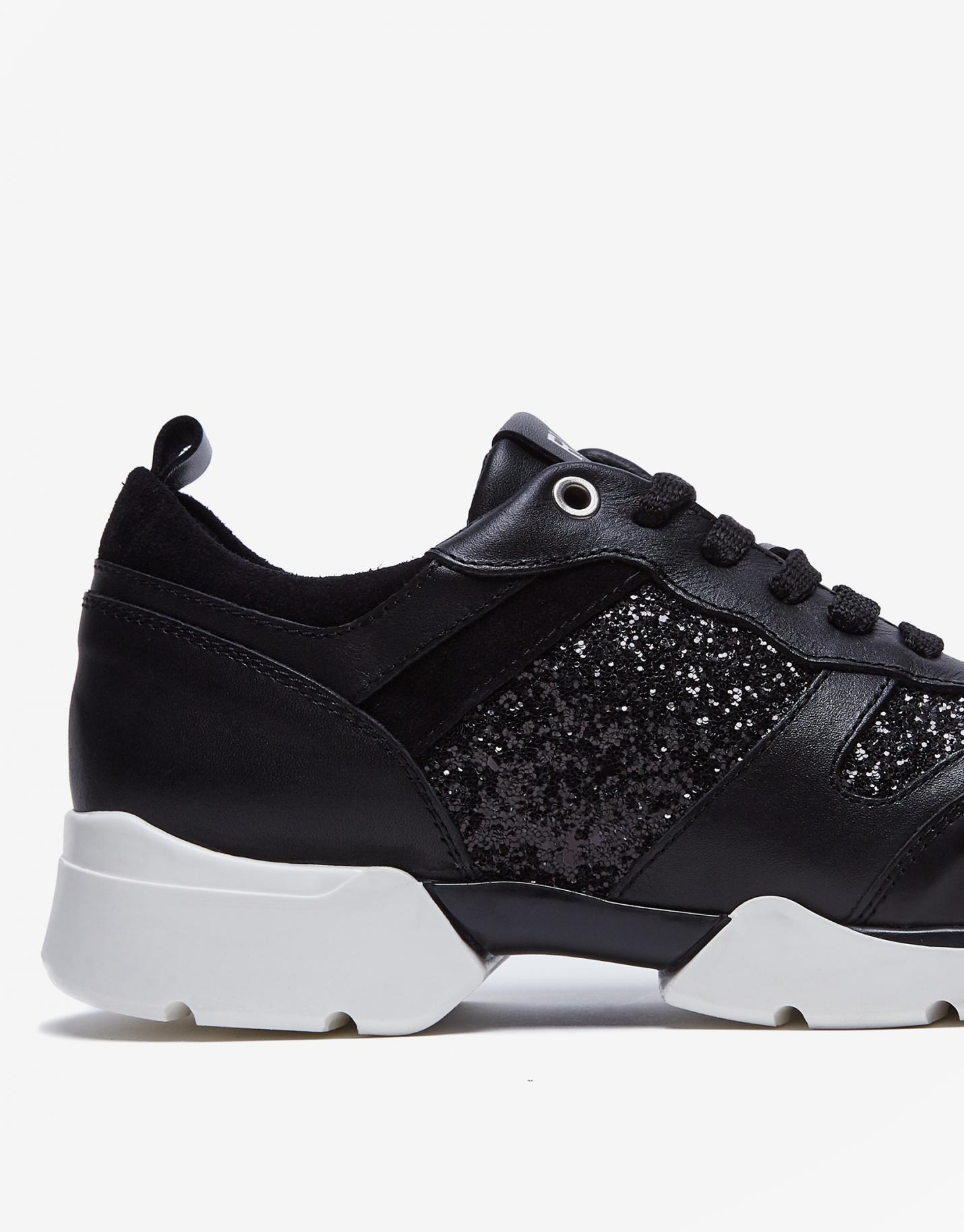 Zapatilla deportiva elaborada en combinación de pieles en tonos negros con detalles en textil acabados en glitter. Suela ligera en color blanco y tirador en el contrafuerte trasero. Cierre mediante cordones a tono y acabados metálicos en plateado.