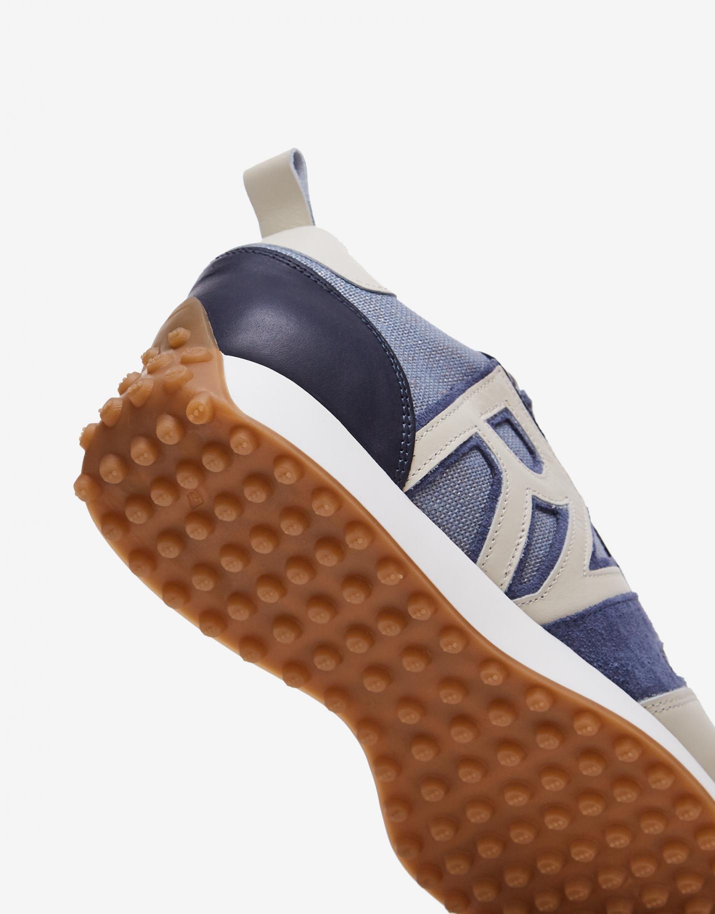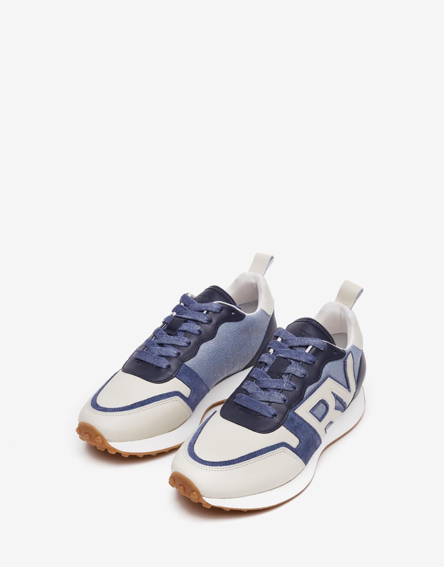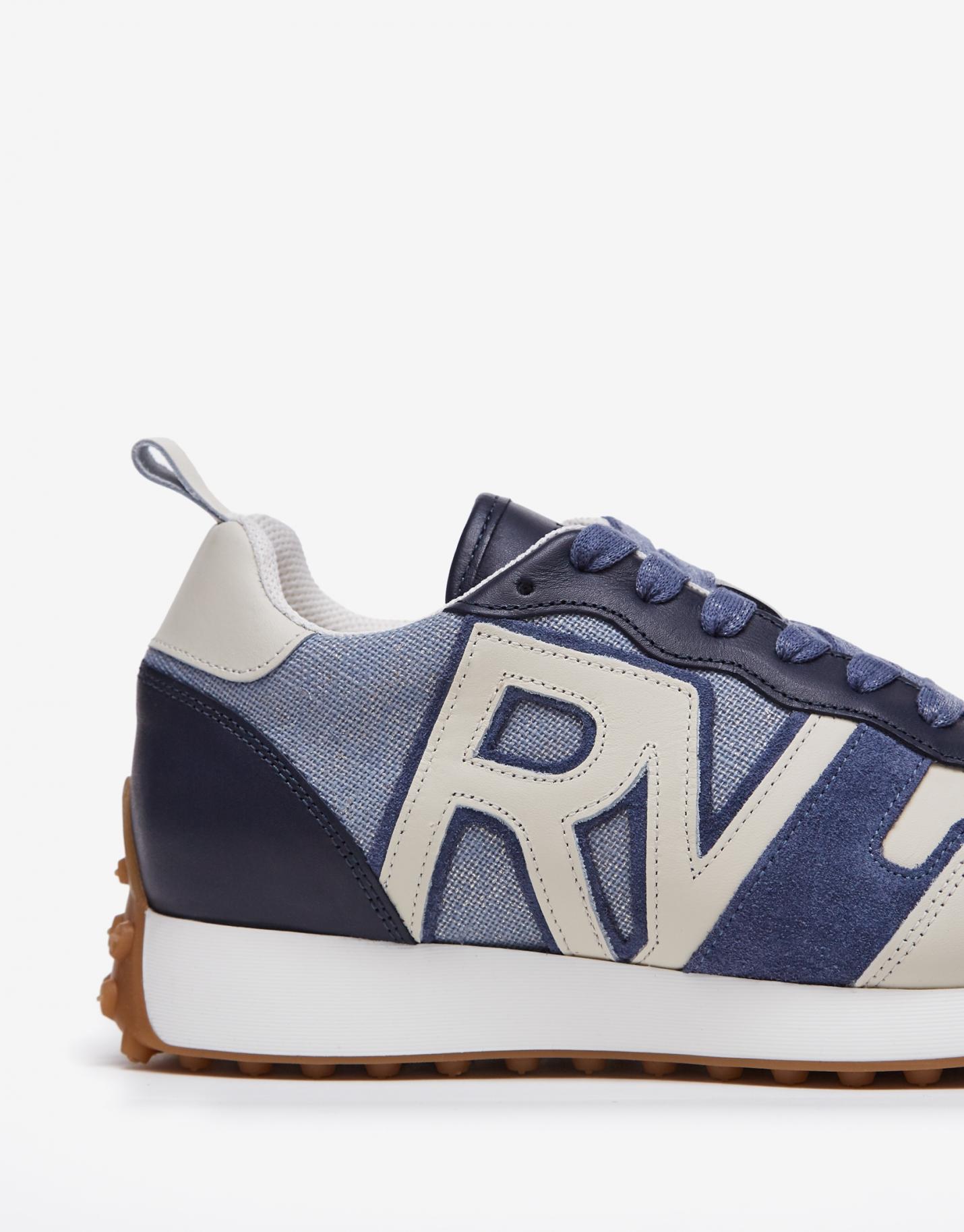 Zapatilla deportiva elaborada en combinación de piel color crudo, ante en color azul y tejido en color azul perla. Suela color blanco, cierre con cordones en azul y detalle de logo RV en laterales.