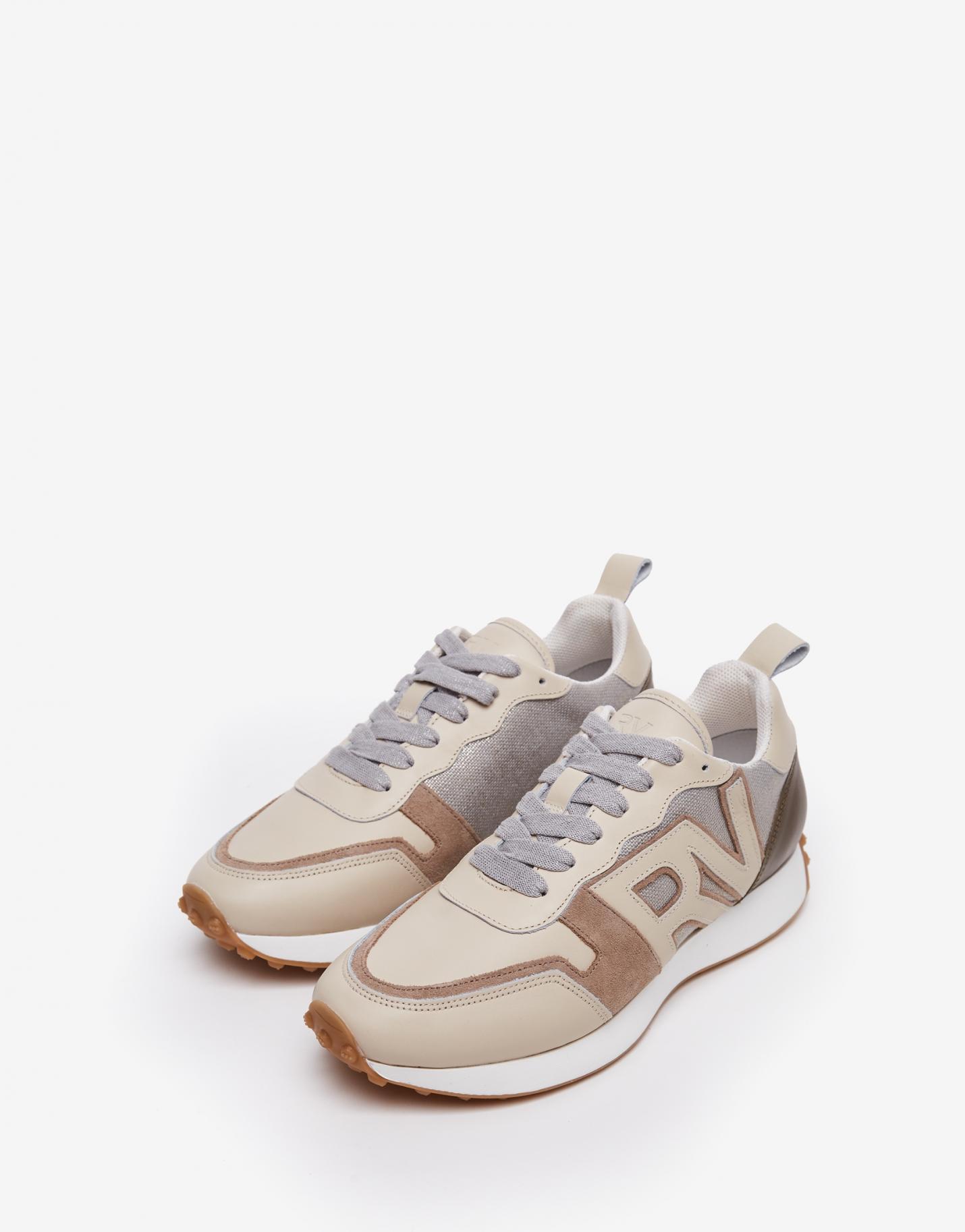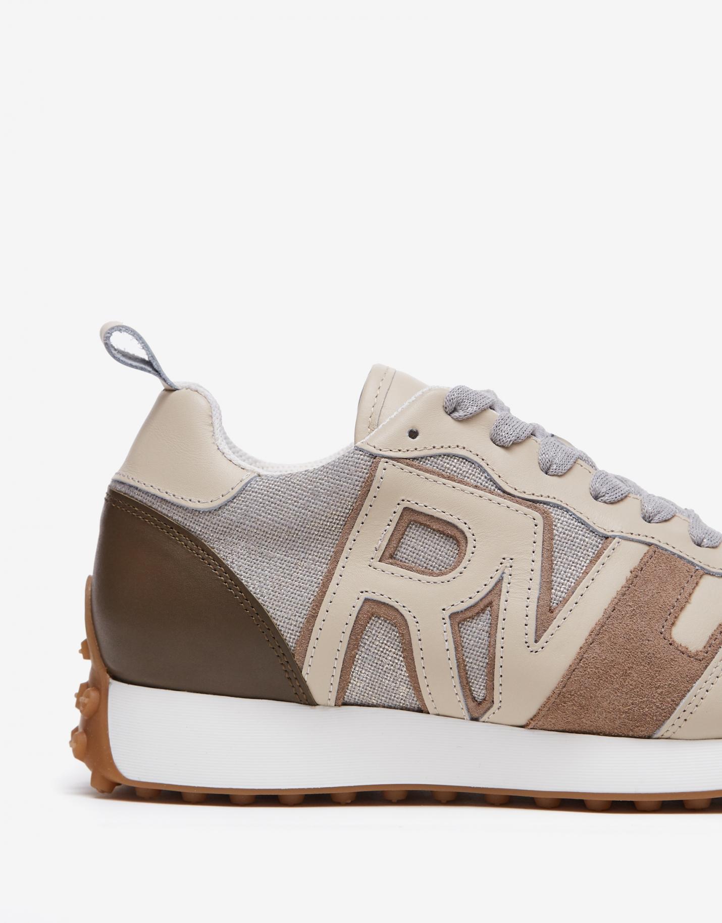 Zapatilla deportiva elaborada en combinación de piel color beige, ante en color cámel y tejido en color gris perla. Suela color blanco, cierre con cordones en gris y detalle de logo RV en laterales.