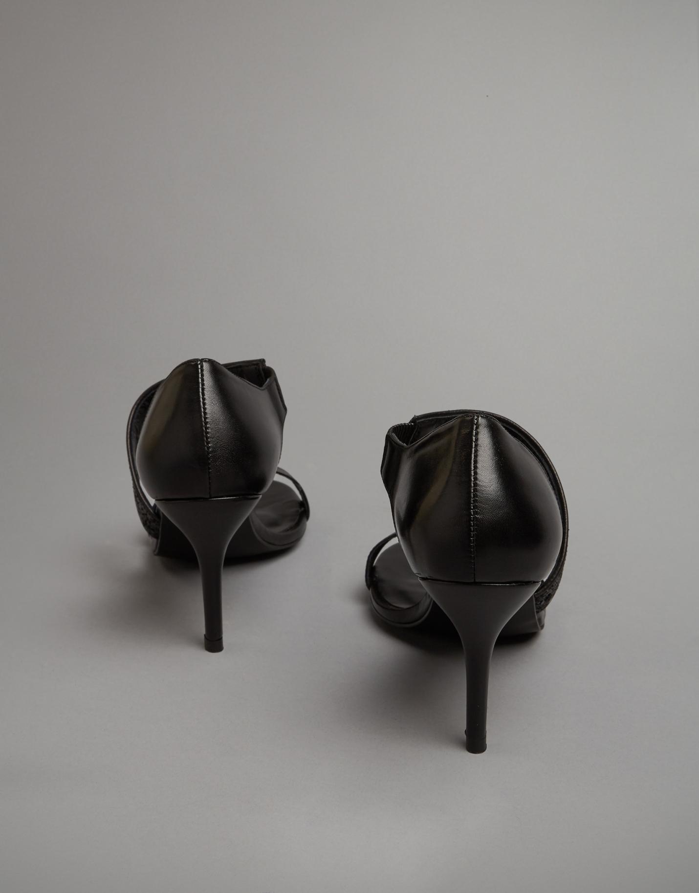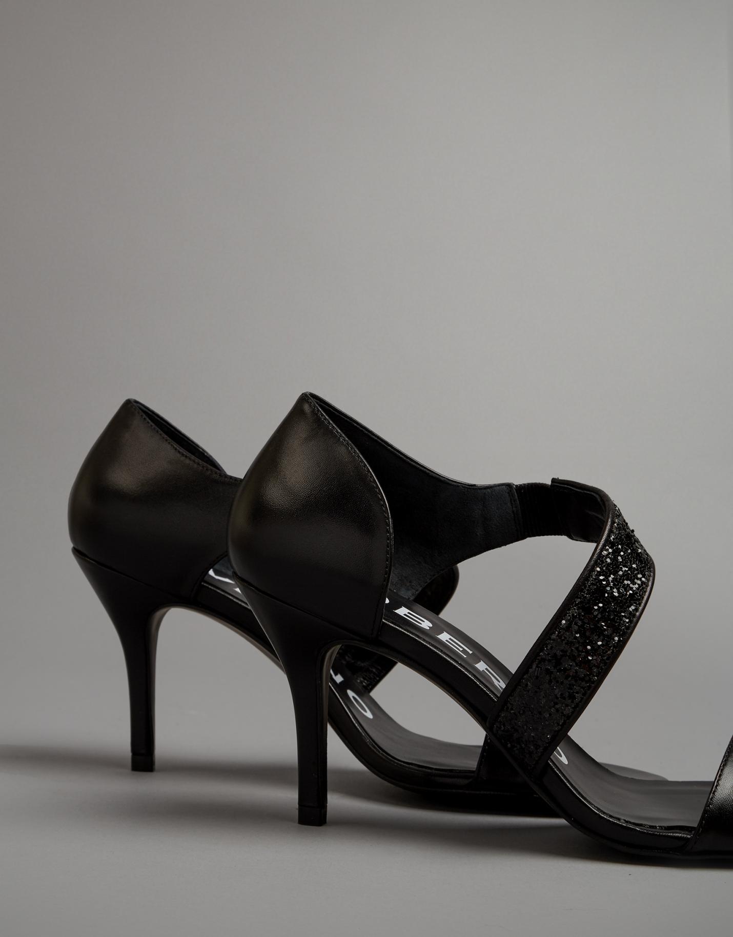 Sandalia de tacón elaborada en piel color negro con tira cruzada en acabado brillante en el pala. Suela con logo personalizado en el interior. Tacón fino de 9 cms