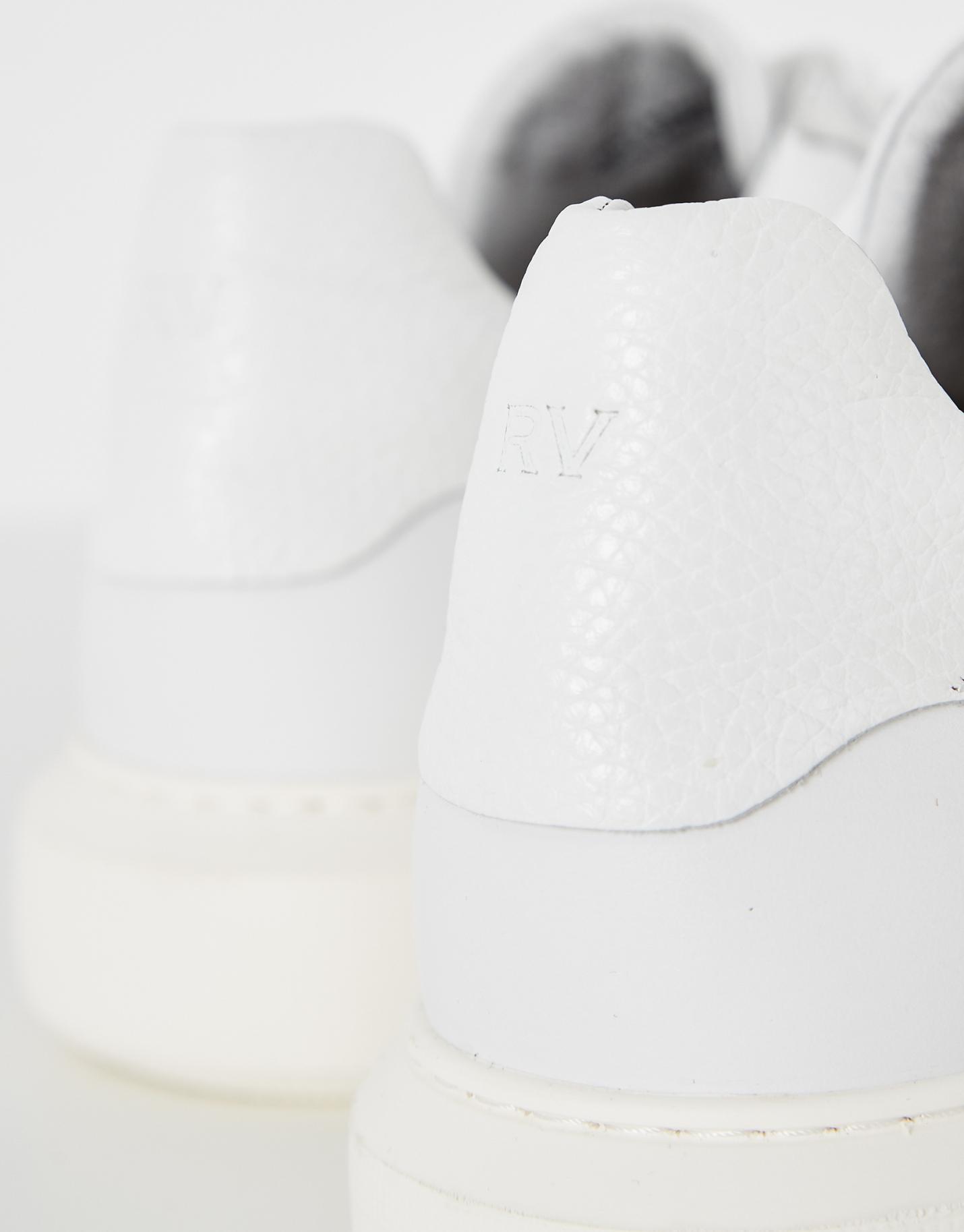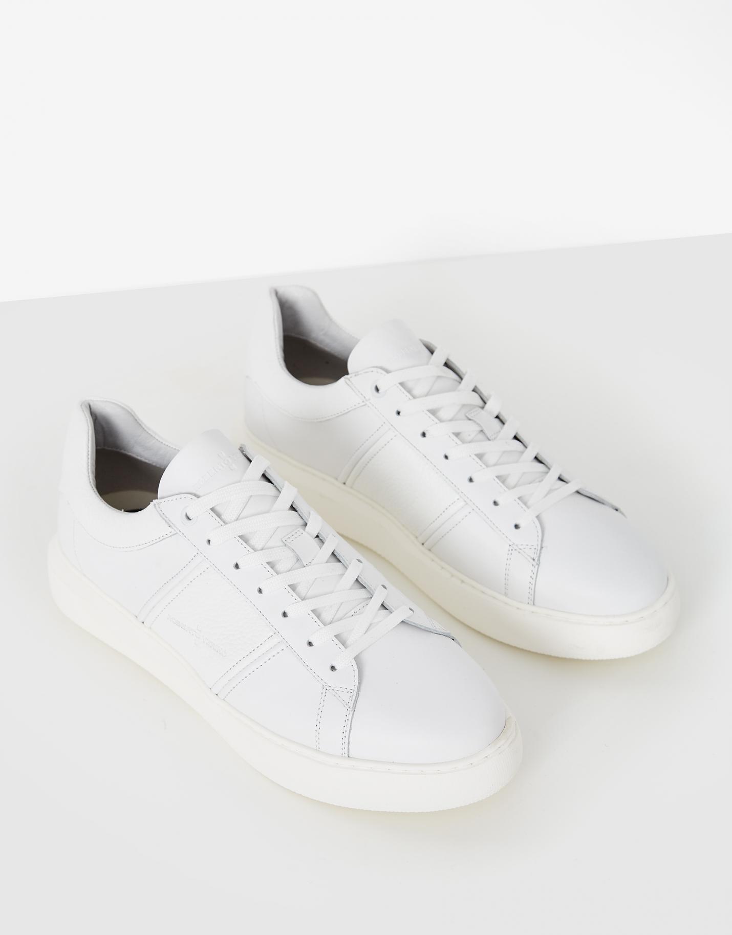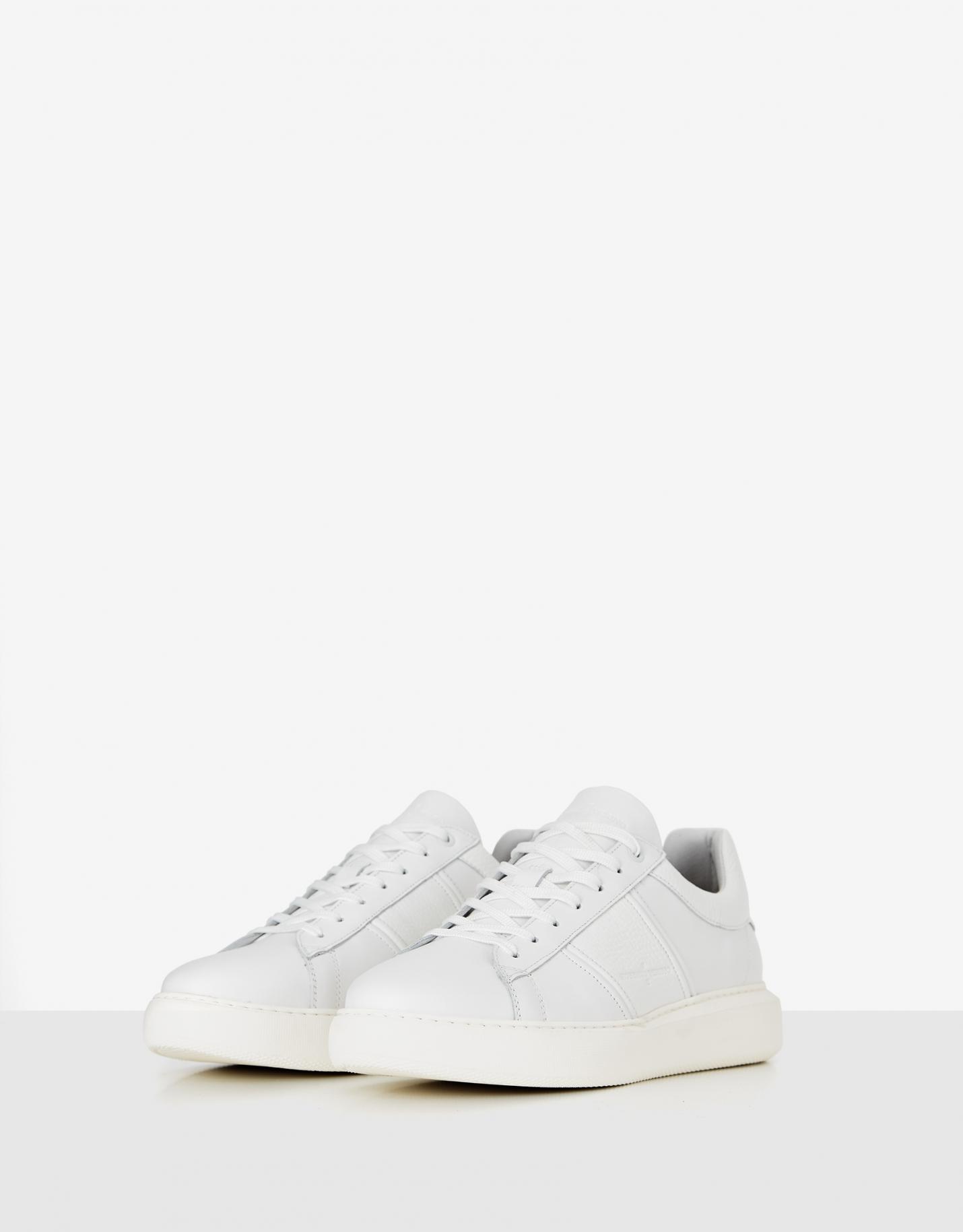 Zapatilla deportiva realizada en una combinación de pieles lisa y grano color blanco, con personalización grabada en lengüeta, lateral y talón.