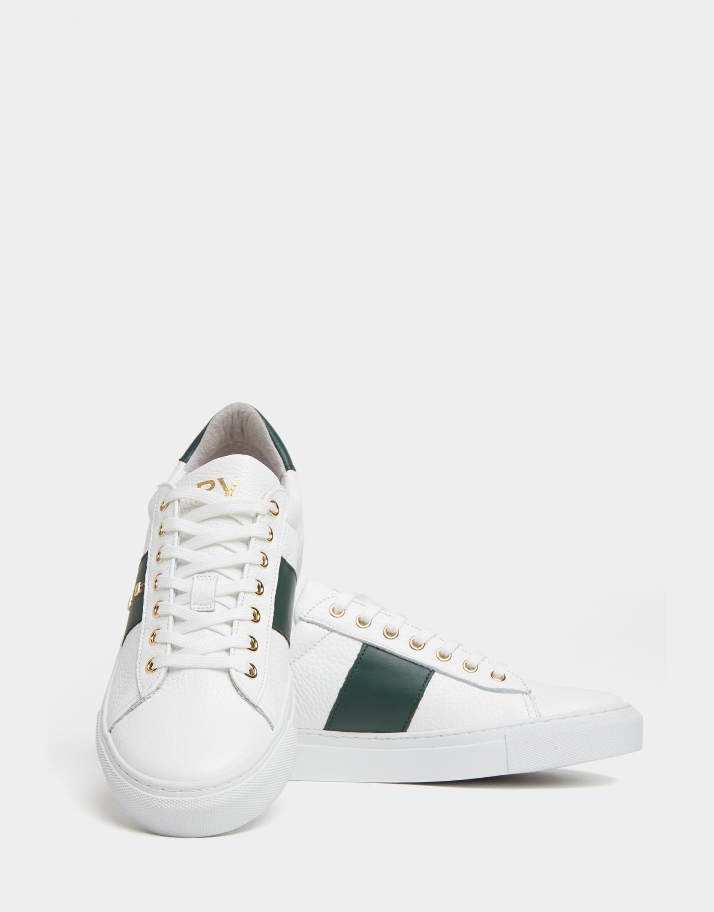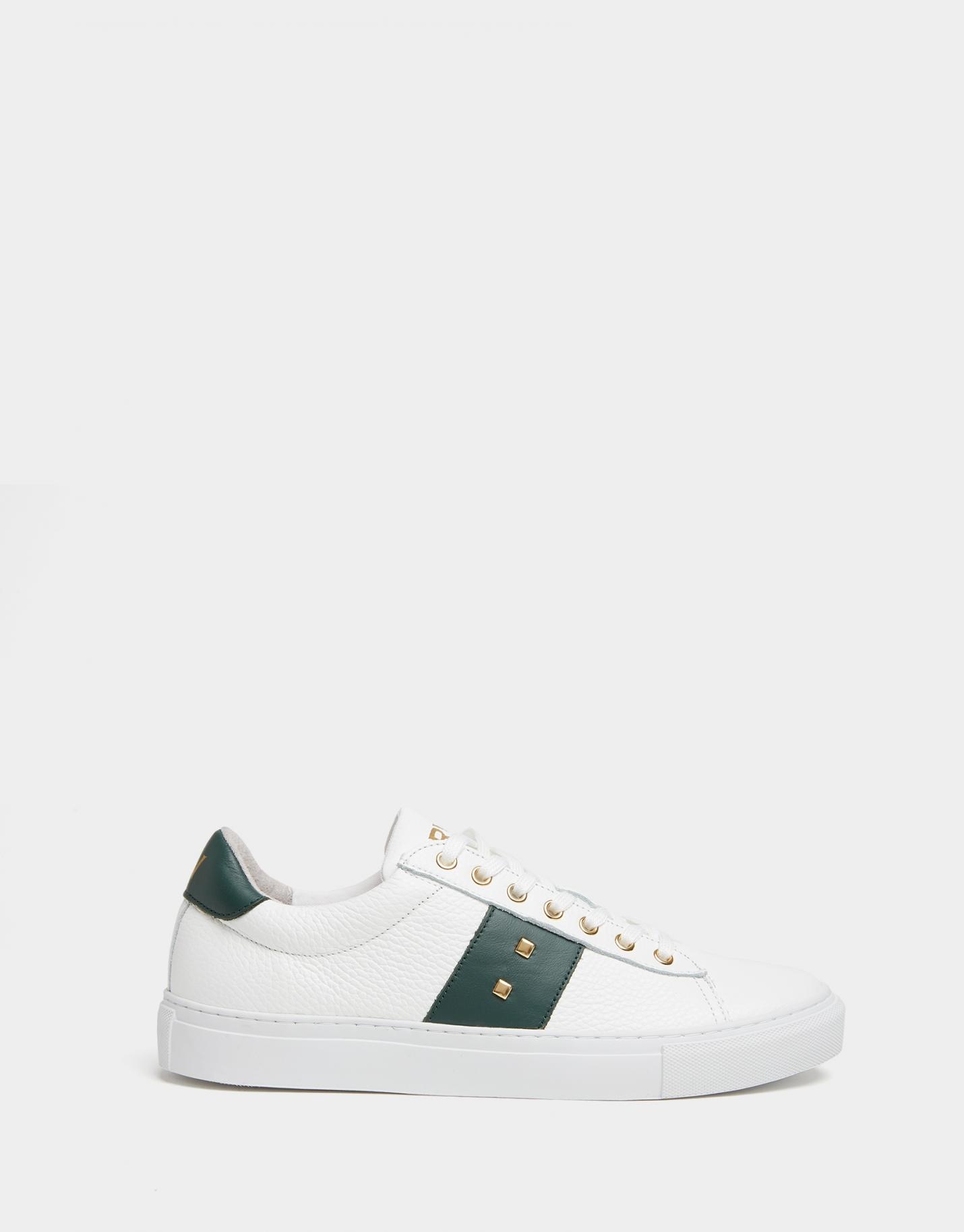 Zapatillas deportivas fabricadas en piel color blanco con detalle de cubos en tachuelas en franja lateral verde oscuro y en lengüeta. Cierre de cordones y detalle a contraste en empeine.