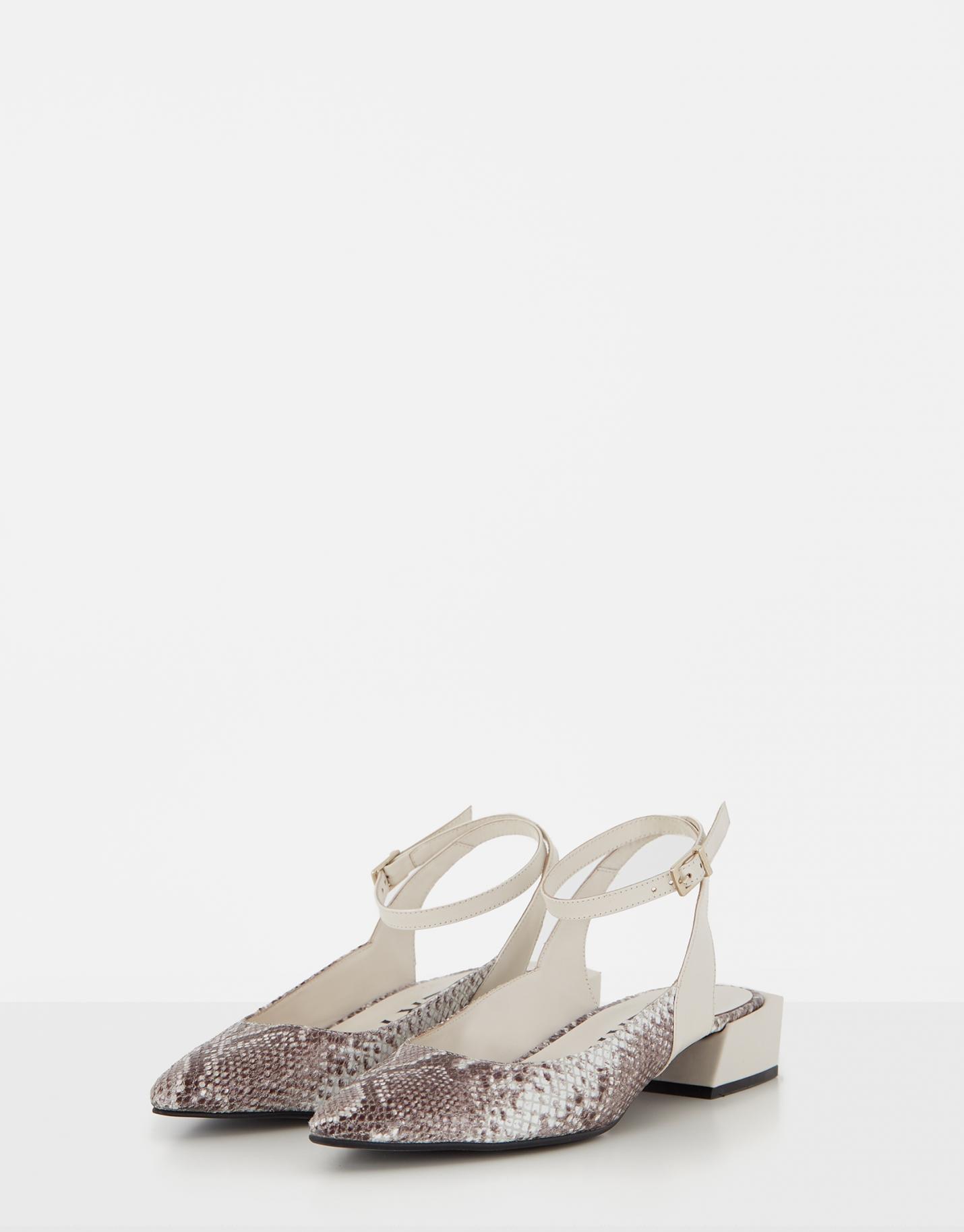 Zapato destalonado con puntera afilada fabricada en combinación de piel print serpiente con piel napa color beige atada al tobillo por una correa con hebilla. Tacón cuadrado de 3.5 cm.