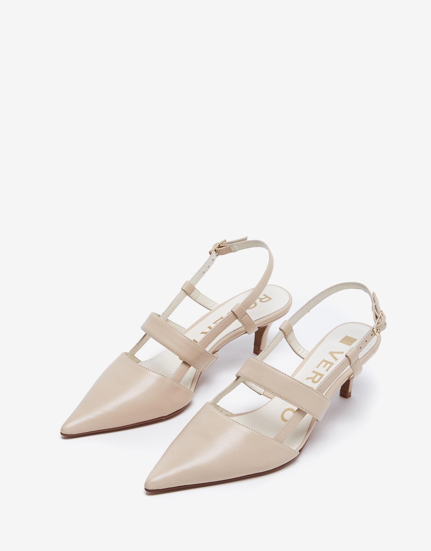 Zapato de salón de tacón medio fabricado en piel color beige, destalonados con tira regulable de sujeción en la parte de atrás y tira de la pala a tono. Altura de tacón: 5.5 cm